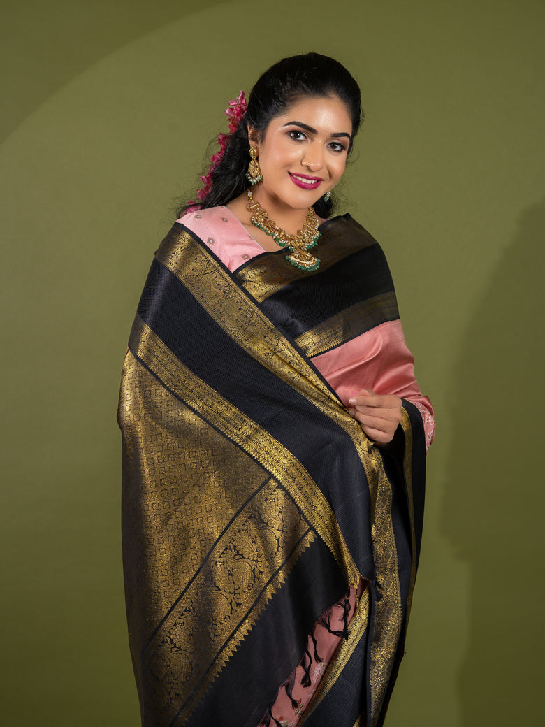 Kanjeevaram silk saree features a intricate floral and peacock motif embroidery on the of the saree. The contrasting gap border and brocade pallu add an elegant touch. The saree comes in a stunning onion-pink color and includes contrast blouse piece with a border .