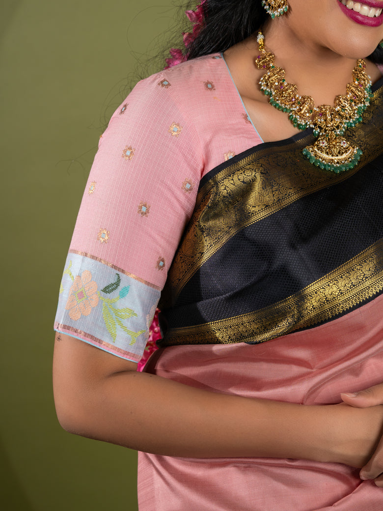 Zari Kota blouse features a light-pink color with intricate gold zari buttis.