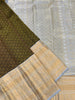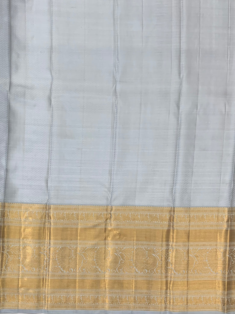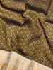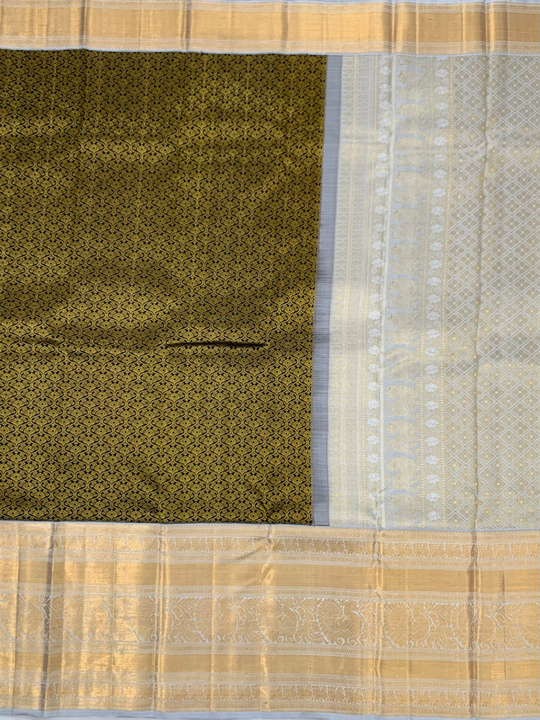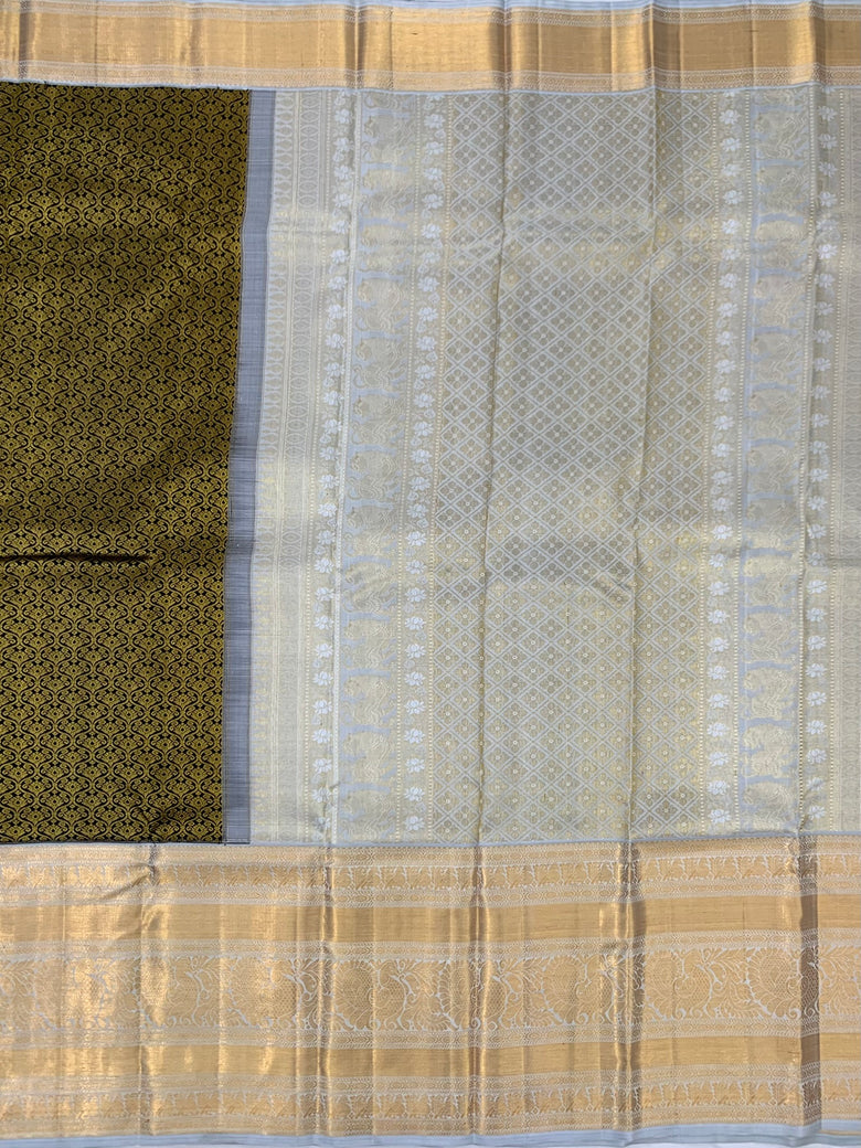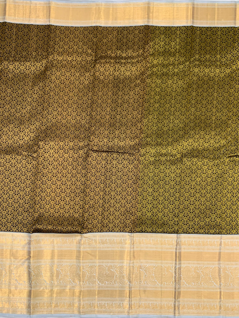 This Kanjeevaram silk saree features a stunning weave of gold zari floral brocade all over, with a contrasting peacock motif border and brocade pallu. It comes in a classic black color and a plain zari border blouse for a complete and elegant look.
