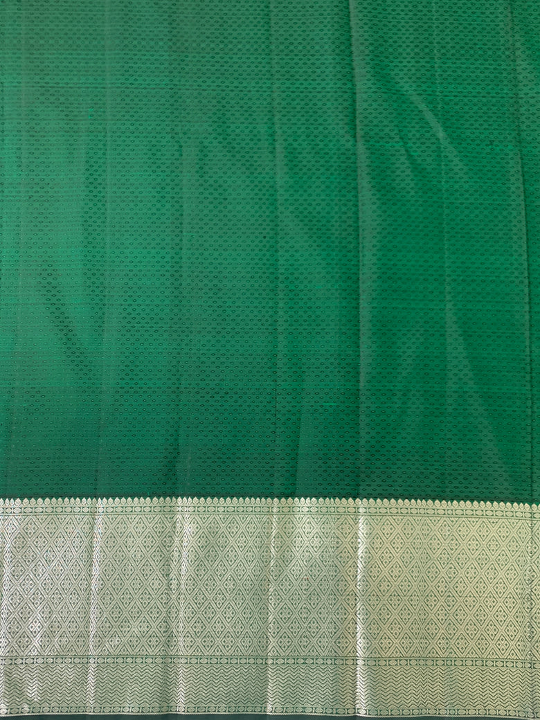 This Kanjeevaram Silk Saree showcases a brocade geometric design with polka-dot butta, accented with silver zari. The contrasting brocade border and pallu add a touch of elegance, while the plain blouse features a matching border. Available in a stunning Lemon-Yellow hue.