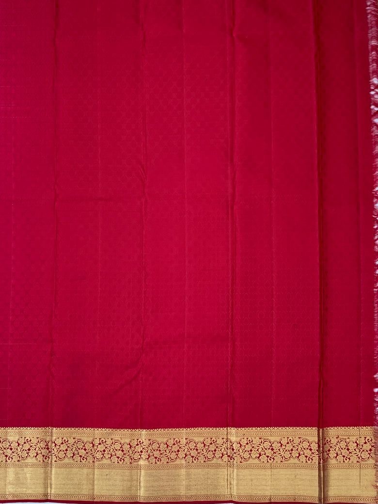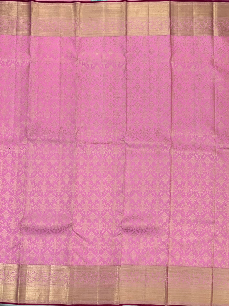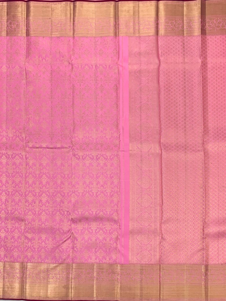 This Kanjeevaram silk saree features a beautiful gold zari floral weave all over, with a self floral border and brocade palu. The light-pink color adds a touch of elegance, while the contrast plain blouse with zari border completes the look.