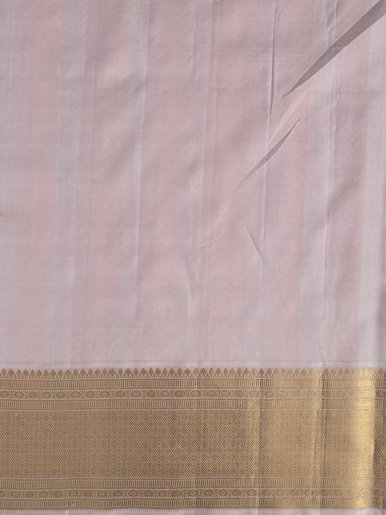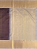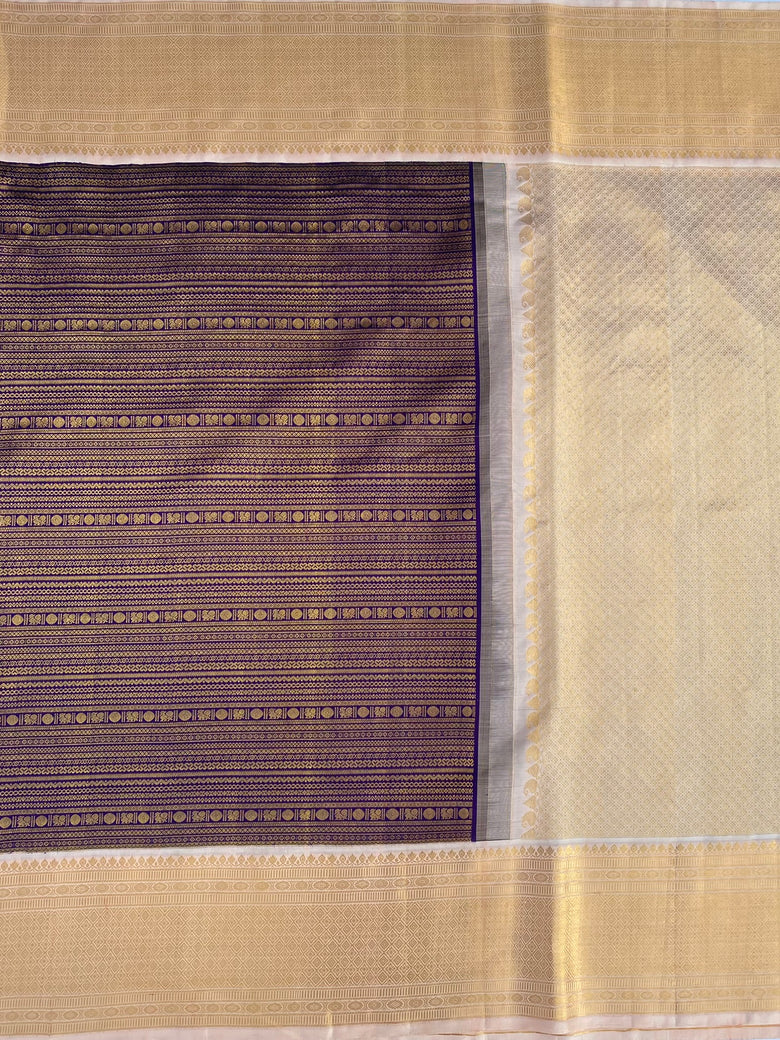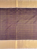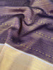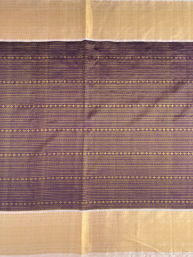 This Kanjeevaram silk saree features an all-over design of gold zari horizontal brocade, accented by a contrast brocade border and pallu. Its rich Purple color adds elegance, while the blouse is adorned with a zari border to complement the saree.