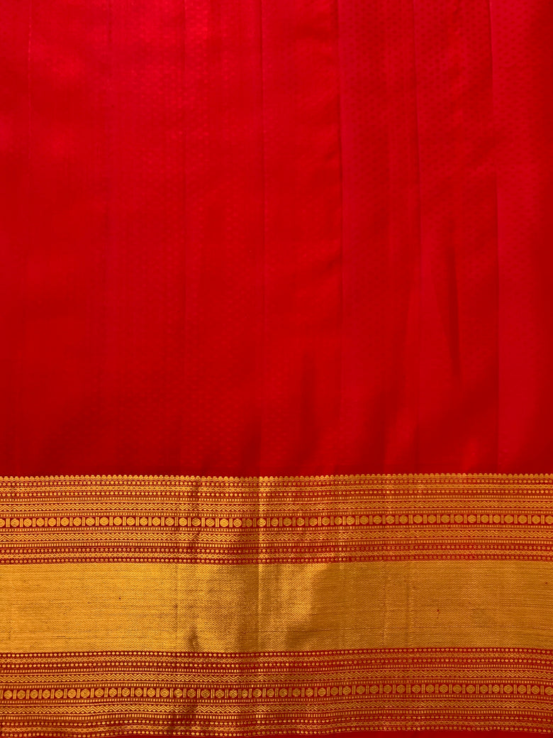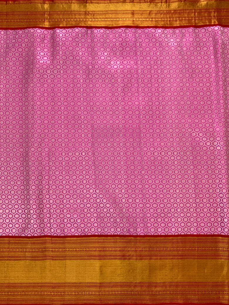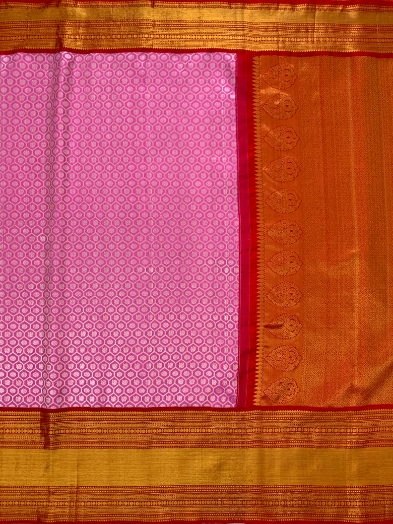 This Kanjeevaram Silk Saree is crafted in a striking hue of pink, featuring an exquisite all-over silver zari geometrical design with motif butta, contrast brocade gold zari border, and pallu. The finished product includes a contrast plain blouse with zari border. This luxurious piece is a special combination of quality craftsmanship and luxurious silk fabric, making it a great choice for a special event.