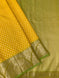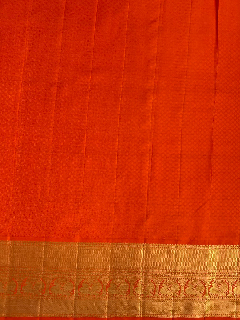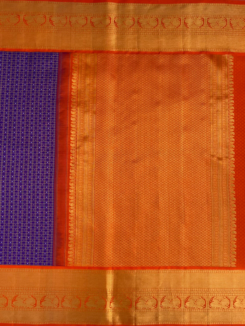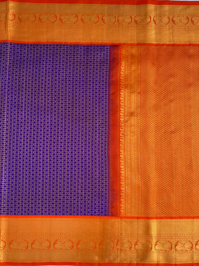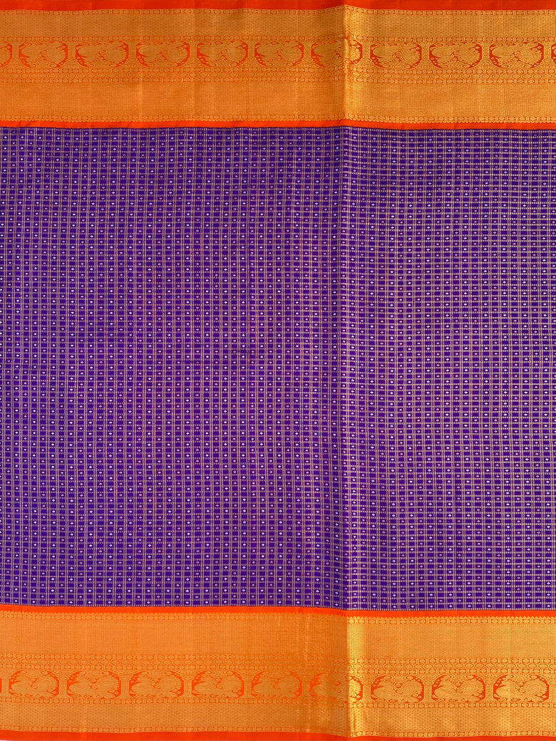 This Kanjeevaram silk saree features a stunning weave with all-over gold zari checks and a silver zari geometrical design on the saree. The contrast of a traditional peacock motif border and brocade pallu add a touch of elegance. The saree comes in a regal shade of purple and the blouse features a contrasting traditional design with a zari border.