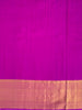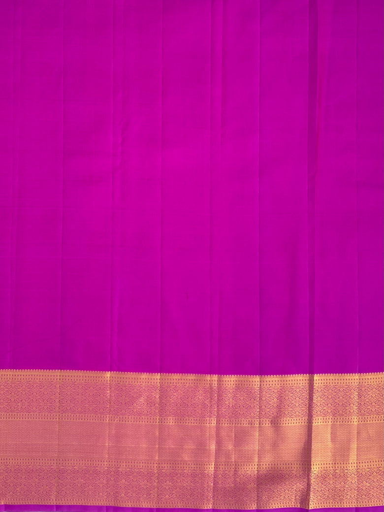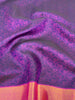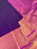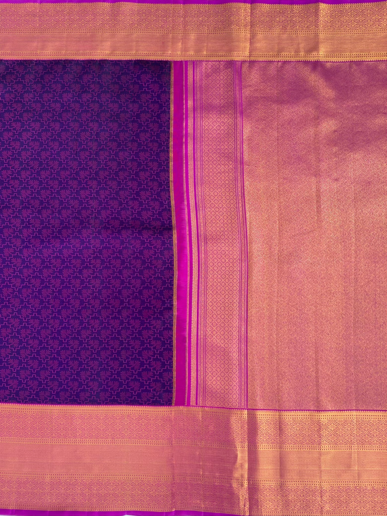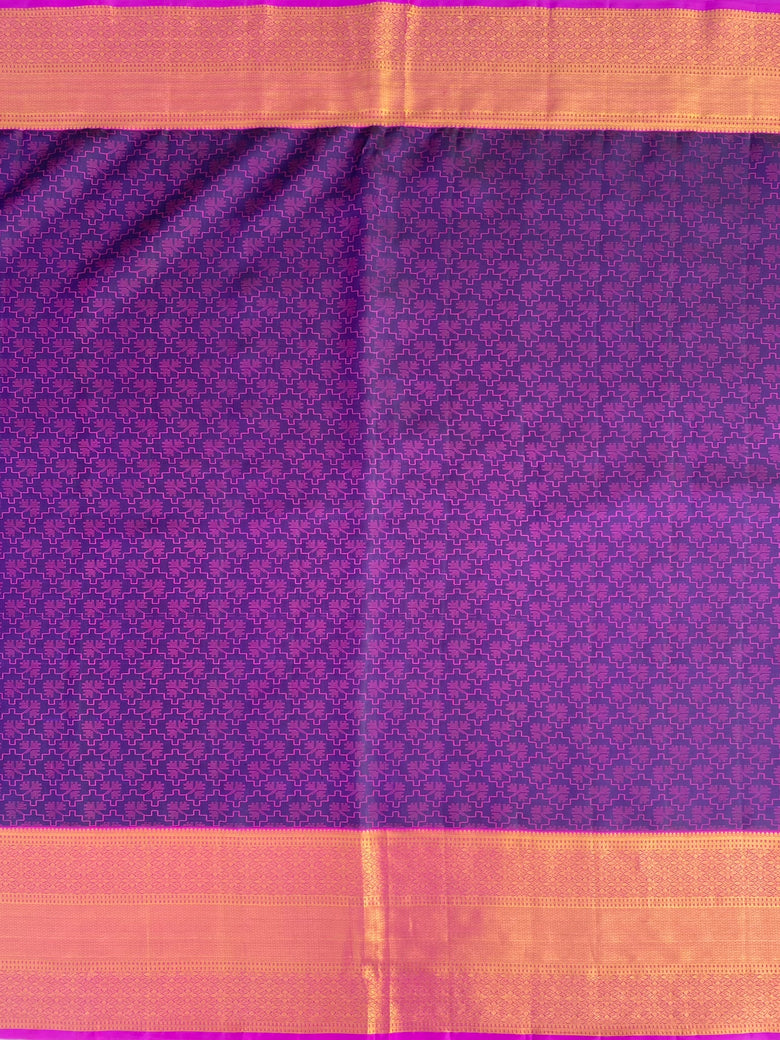 This Kanjeevaram silk saree features an all-over geometrical thread weave design, complemented by a contrast brocade border and pallu. The rich purple color adds to its elegance, while the blouse is a contrast plain with a zari border.