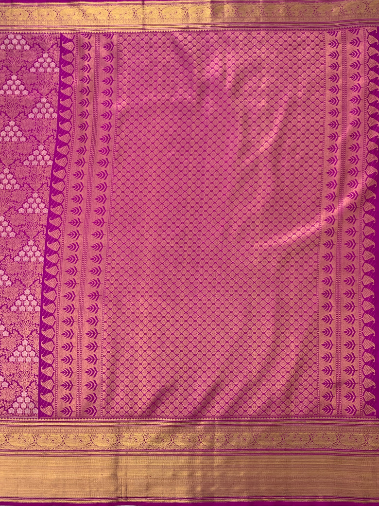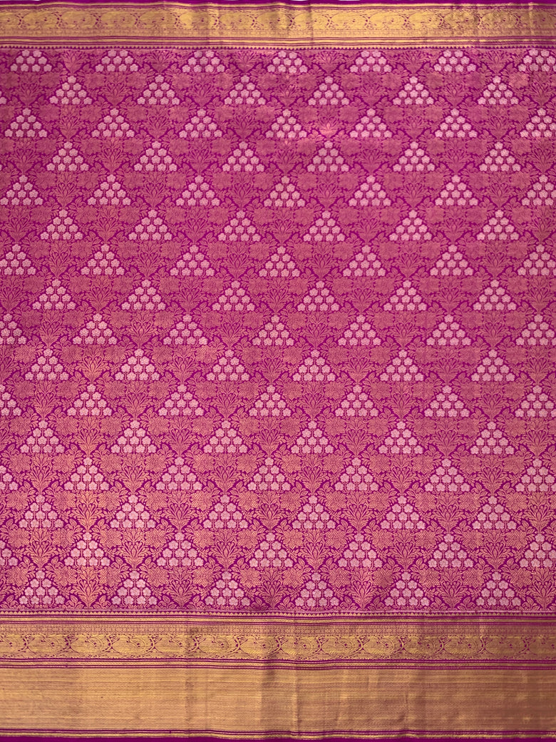 This Kanjeevaram silk saree features an all-over geometric pattern of gold and silver zari floral jaal, self brocade border, and pallu, all in the beautiful color of Rani-Pink. It also comes with a self plain blouse, adorned with a gold zari border. This saree is intricately crafted with luxurious materials and sophisticated craftsmanship for a timelessly elegant look. Perfect for any special occasion,