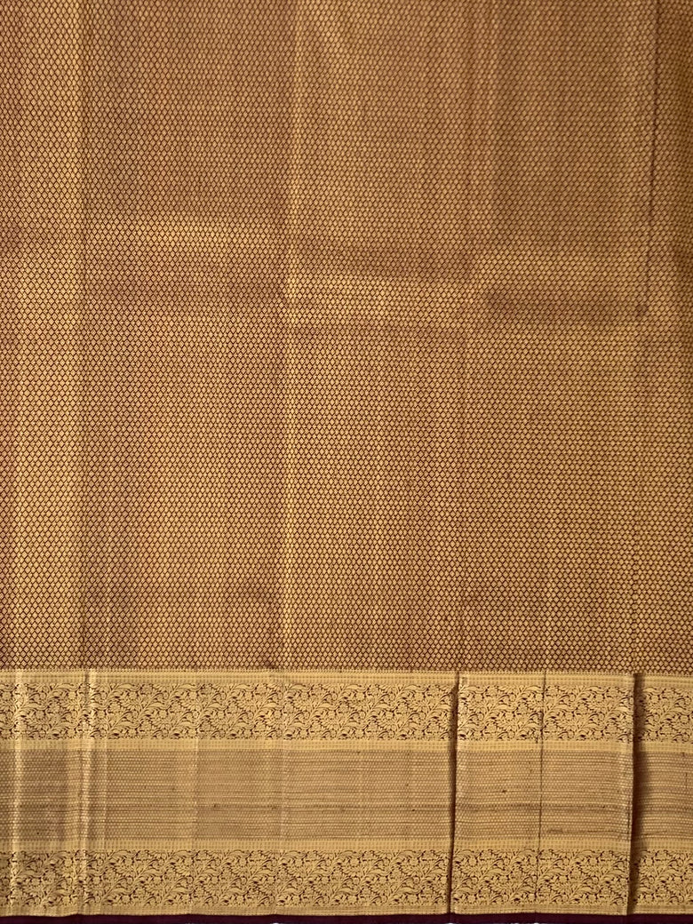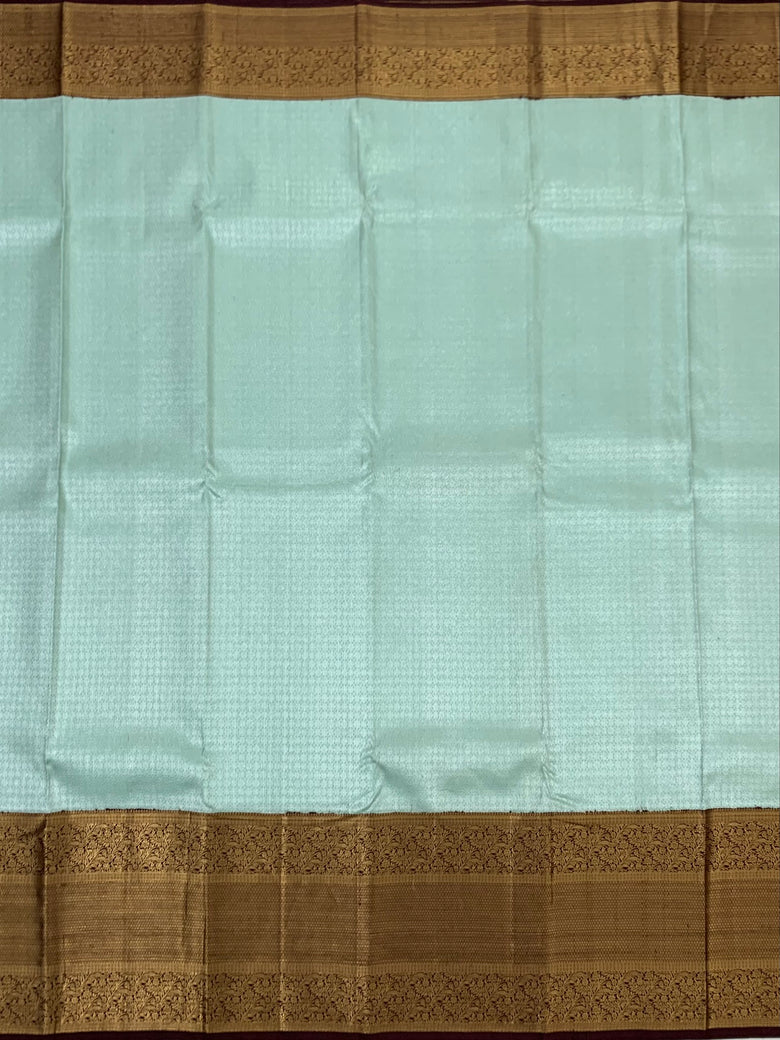 This beautiful Kanjeevaram silk saree boasts an elegant weave of silver zari floral borcade all over its sea-green color. The contrast floral border and pallu add a touch of sophistication. The blouse features a stunning gold zari brocade with a zari border that perfectly complements the saree.