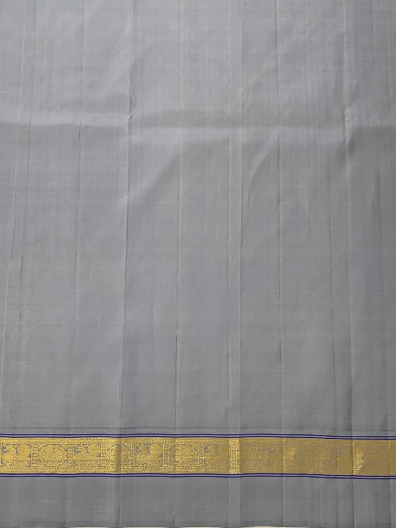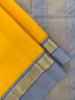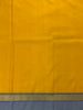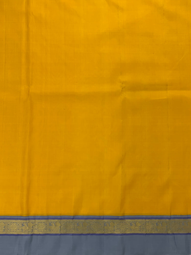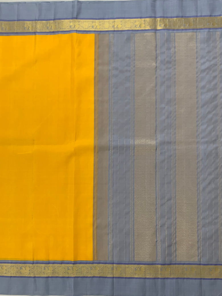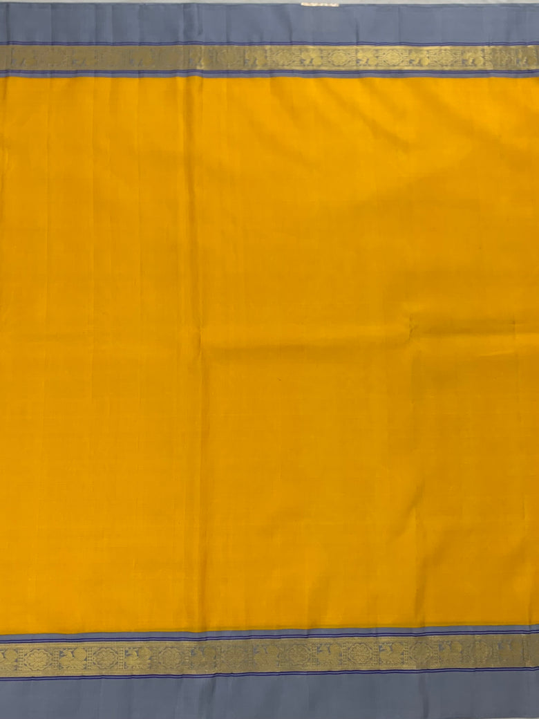 Kanjeevaram Silk Saree features a traditional plain pattern with an ornate Gold Zari Vintage Kanjeevaram border and pallu, and is designed in a lively Yellow tone. The included blouse is styled simply with a matching Zari trim.