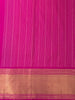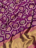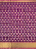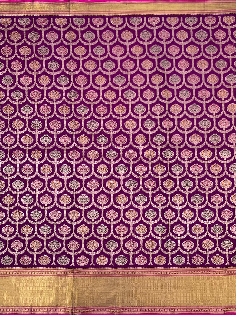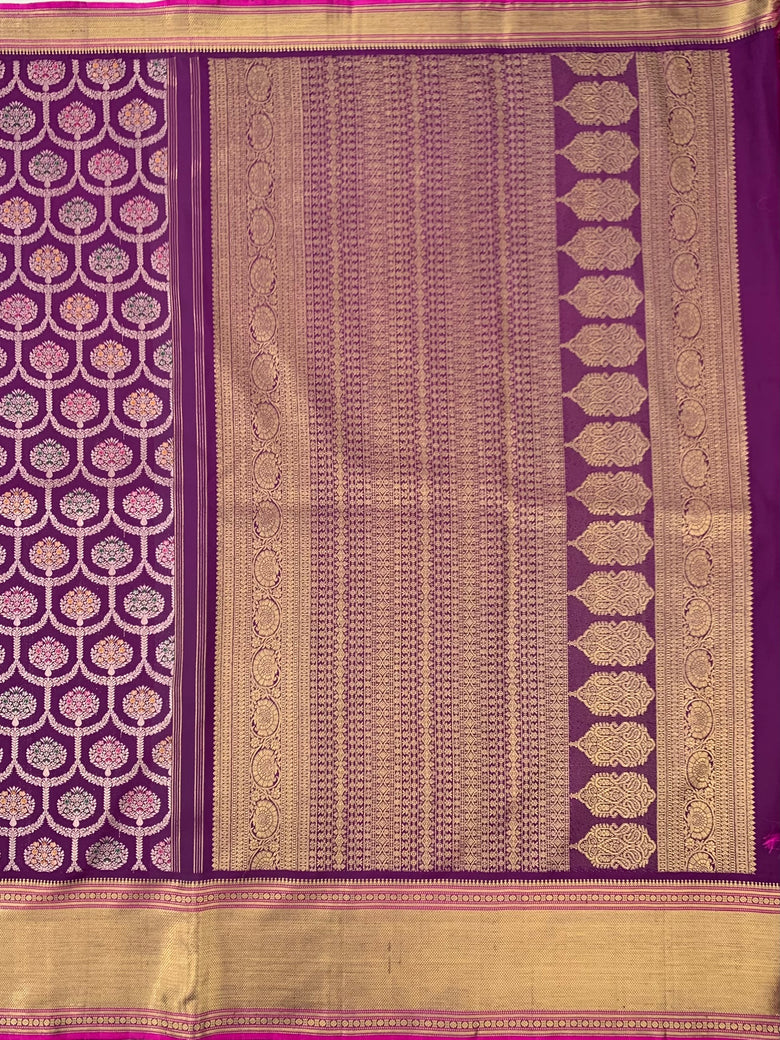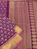 This Kanjeevaram Silk Saree is characterized by an intricate silver zari weave, featuring a geometric design and meenakari floral butta throughout the saree. The self gold zari bocade border and pallu add a touch of luxury to the overall look. The saree comes in a rich purple color and is paired with a contrasting blouse featuring gold zari stripes and a zari border.