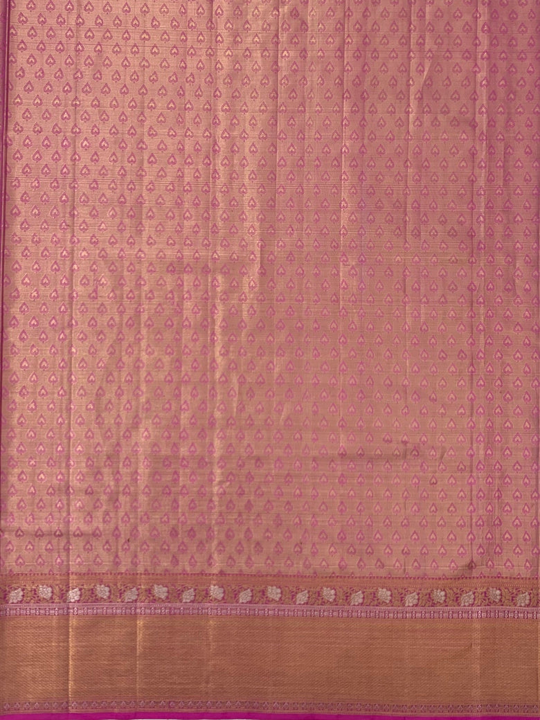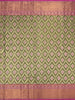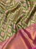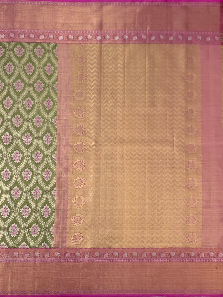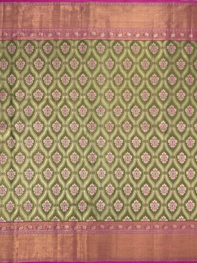This Tissue Kanjeevaram Silk Saree features an all-over design of gold and silver zari, with a mix of geometrical patterns and meenakari floral butta. The saree is bordered with a contrasting brocade design and has a pallu in the same style. The color is a rich Bottle-Green, and the blouse is made of contrast tissue fabric with a gold zari floral butta and zari border.