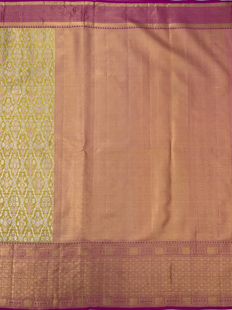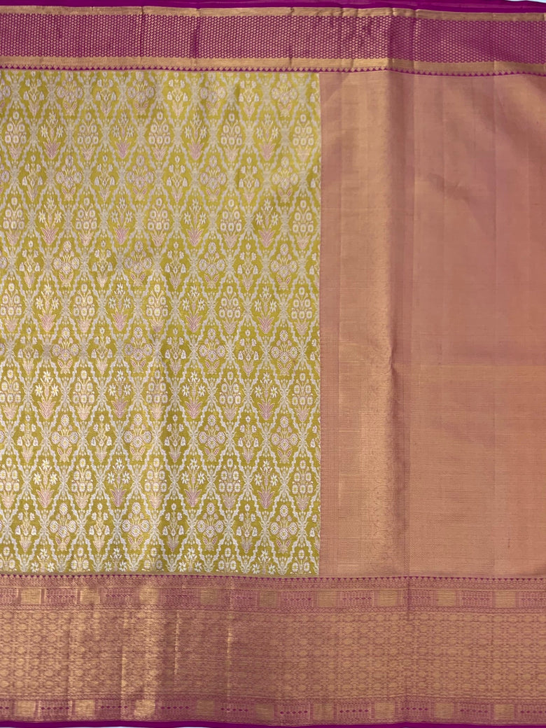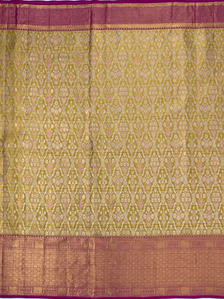 This elegant Tissue Kanjeevaram Silk Saree showcases intricate silver zari geometric designs and stunning gold and silver zari floral motifs. To add a touch of contrast, it is adorned with a brocade border and pallu. The blouse, made of contrasting tissue fabric, is beautifully embellished with gold zari brocade and a zari border, complementing the Mustard color of the saree.
