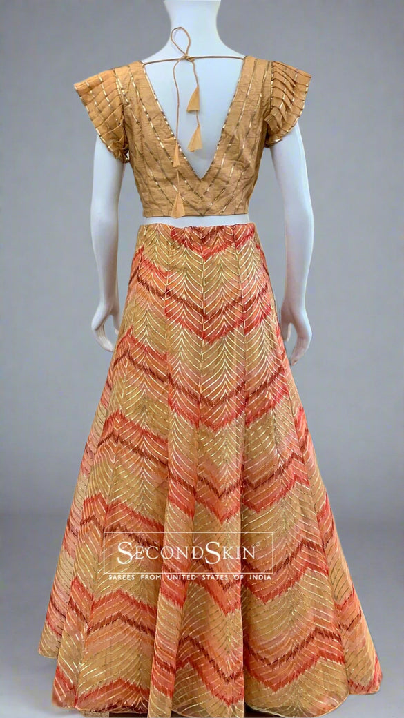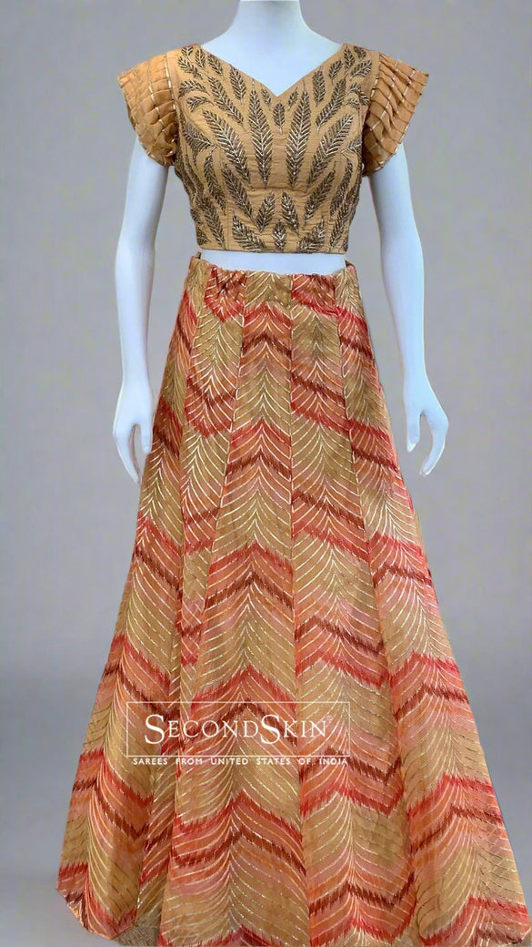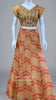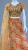 This beige floral lehenga set features hand embroidery on kora silk fabric. The lehenga displays a multi-colour geometrical design, while the blouse is adorned with self leaf buttis. The dupatta is made from a matching kora fabric, with floral buttis and a border.