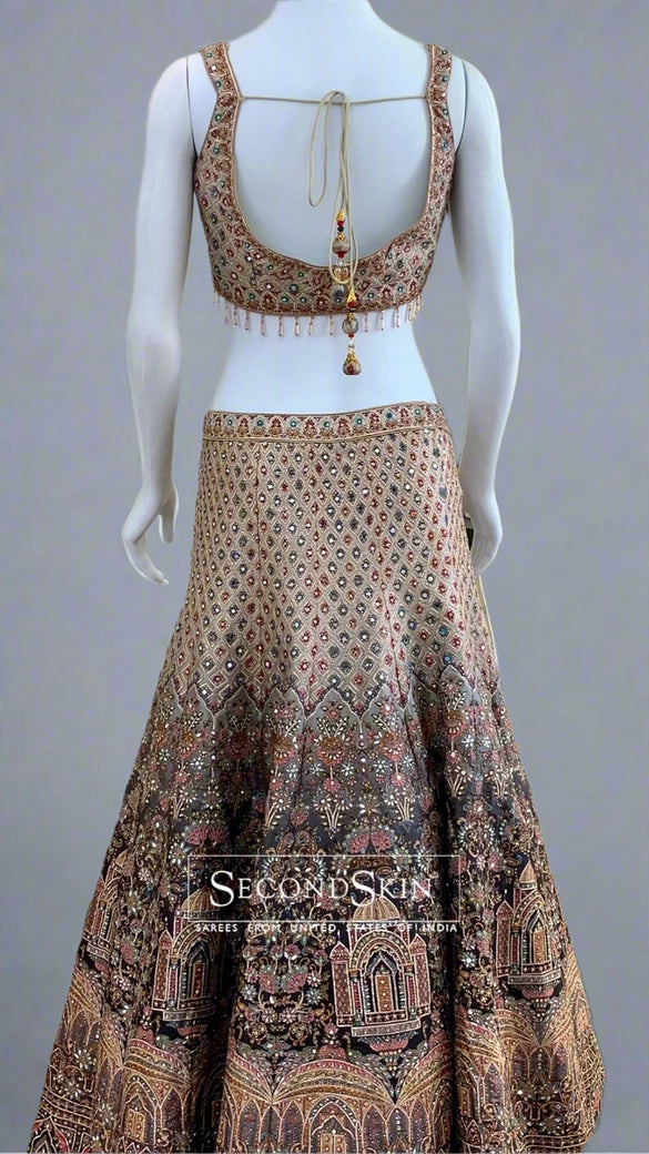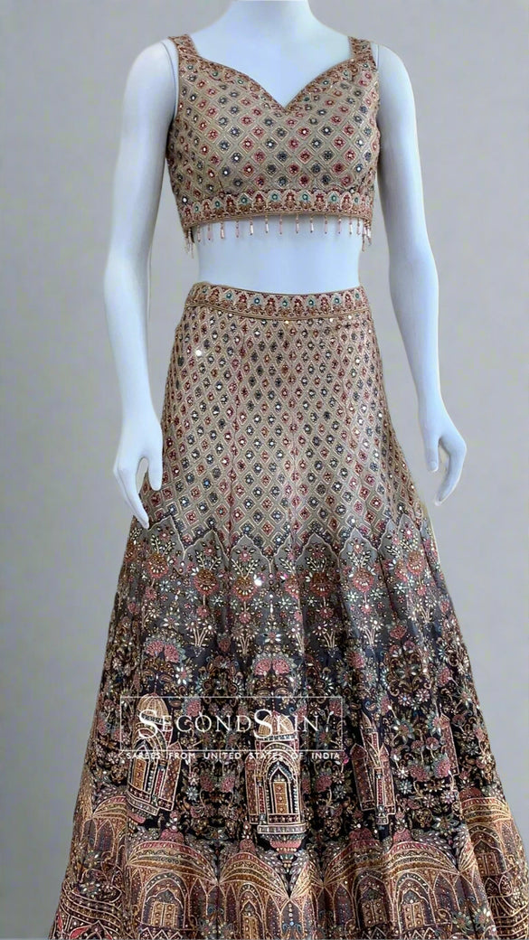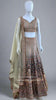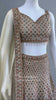 This lehenga set features a cream color with woven gold zari geometric designs and multi-colored floral buttis accented with mirror work and traditional floral patterns. The blouse has a self-design with geometric patterns and the net fabric is adorned with diamond buttis and border details.