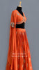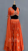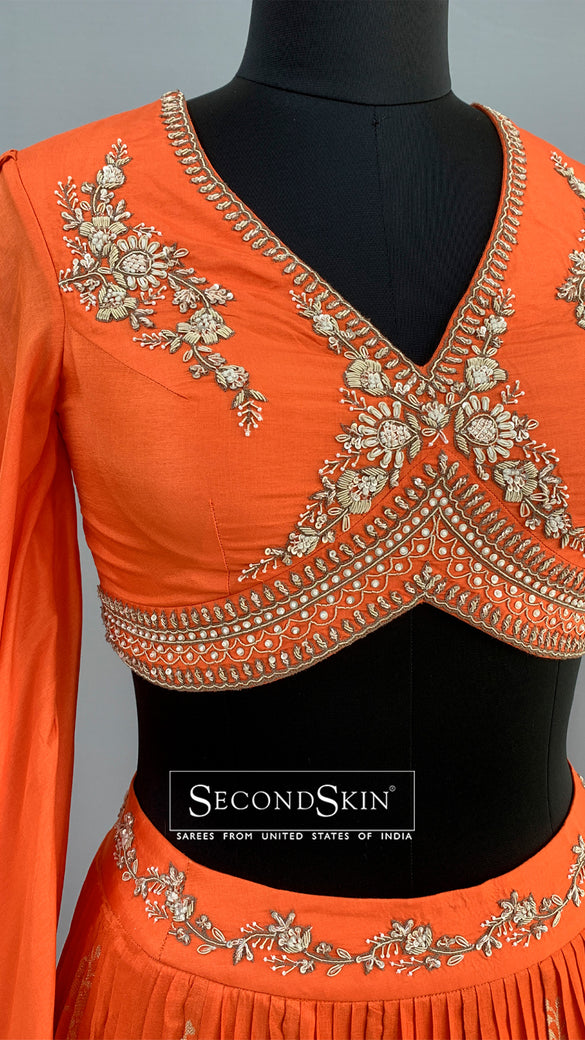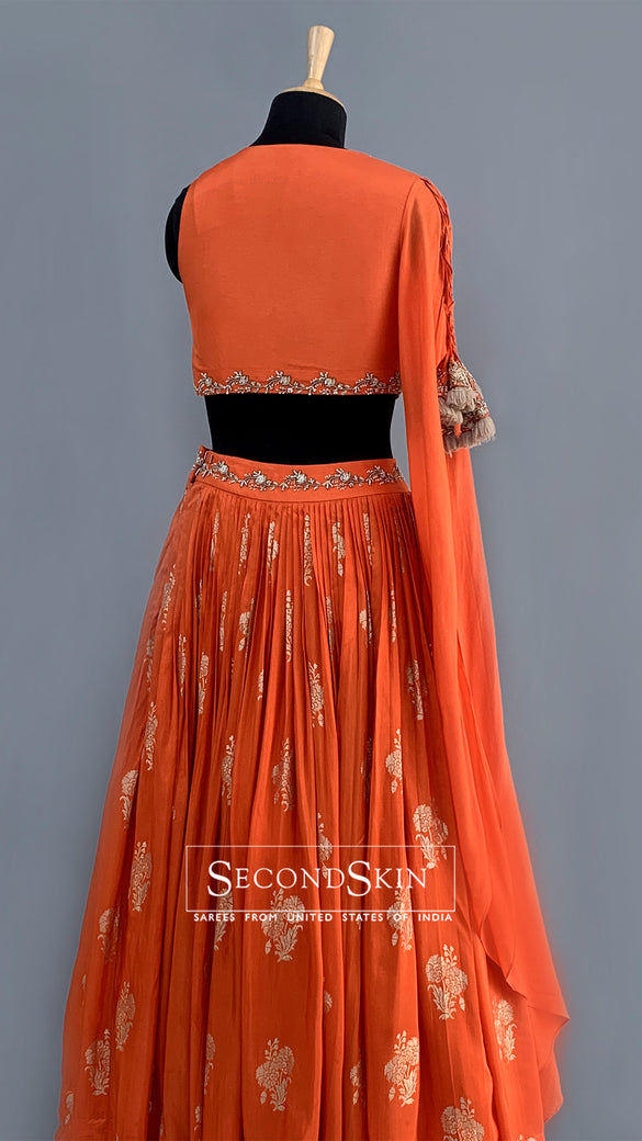 Elevate your look with this Orange Lehenga Set. Fall in love with the intricate design, featuring beautiful gold zari floral butta and delicate embroidery in zardozi, sequins, and pearls on a silk blouse.