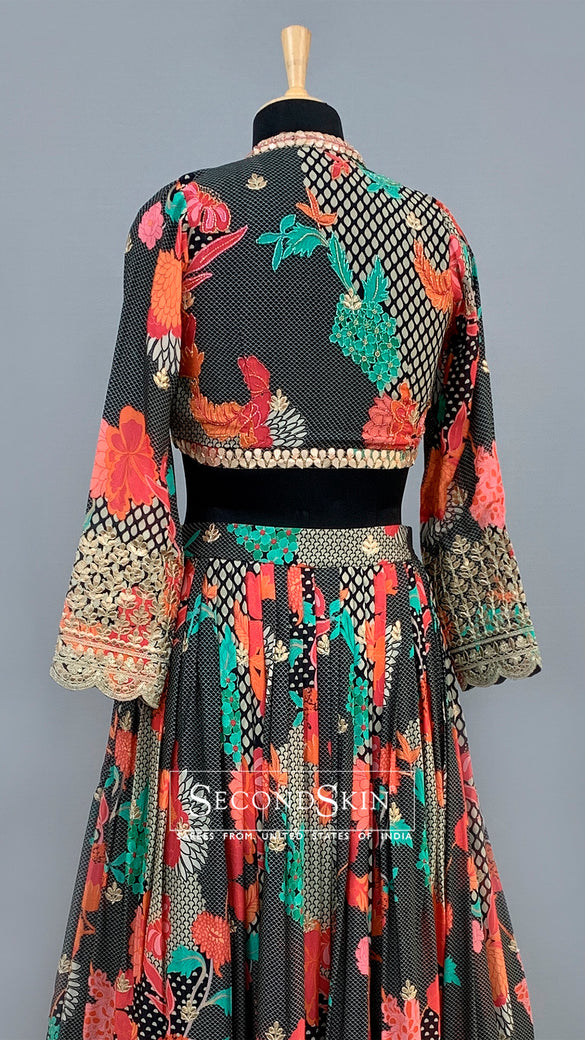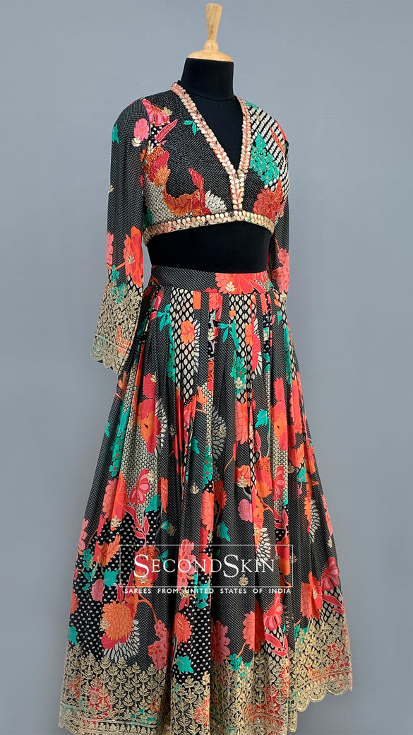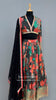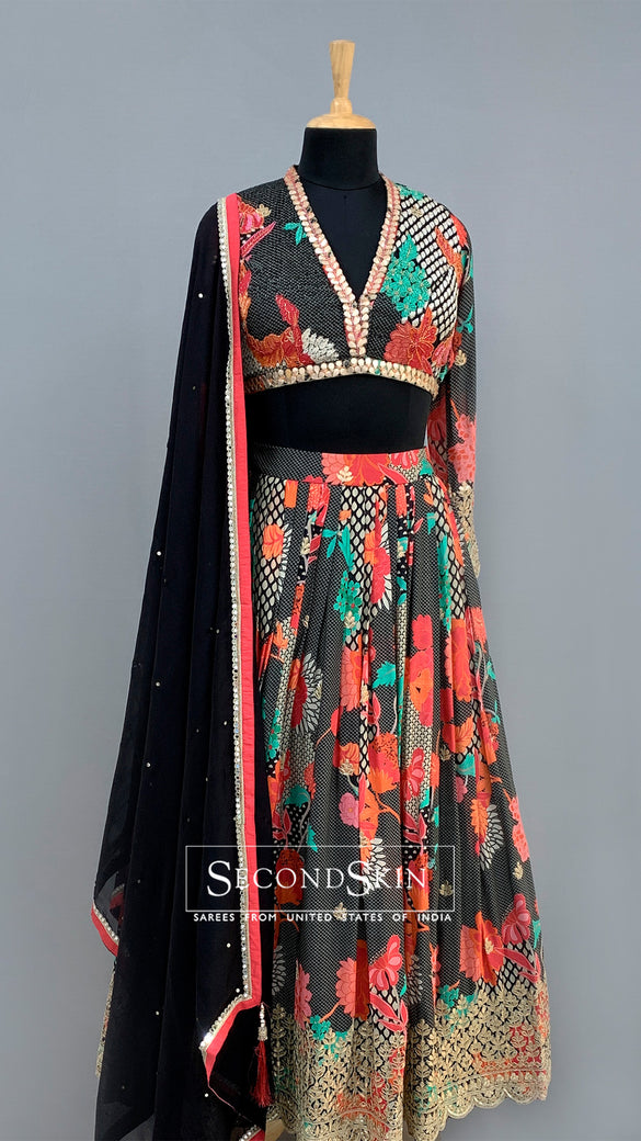 Indulge in the exquisite allure of this luxurious black lehenga set, crafted with delicate georgette fabric and adorned with eye-catching floral prints. The lehenga boasts intricate gotta patti buttis and a scalloped border, while the blouse is embellished with intricate kardana work. Complete the look with the shimmering sequins and delicate lace detailing on the dupatta.