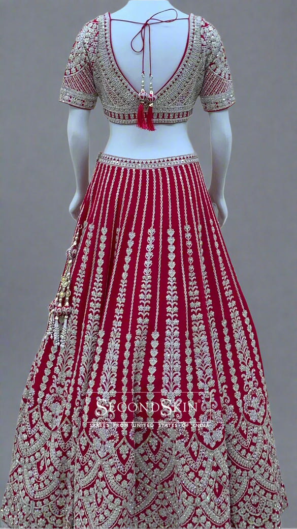 Georgette lehenga in a dark-pink color features intricate thread work floral embroidery and sequence embellishments all over the fabric. The blouse also showcases self thread work floral embroidery, and the matching dupatta is adorned with a border and self floral buttis.
