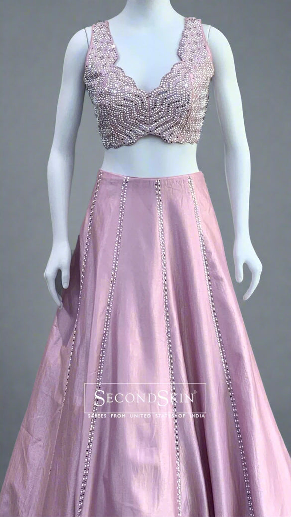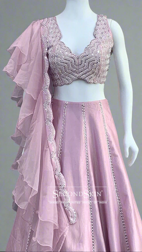 The Lilac Lehenga Set is crafted from luxurious silk fabric and boasts a stunning diamond weave pattern. The lehenga is embellished with stone buttis stripes, while the blouse features exquisite self-work design. The dupatta is made of a self plain kora fabric with a border.