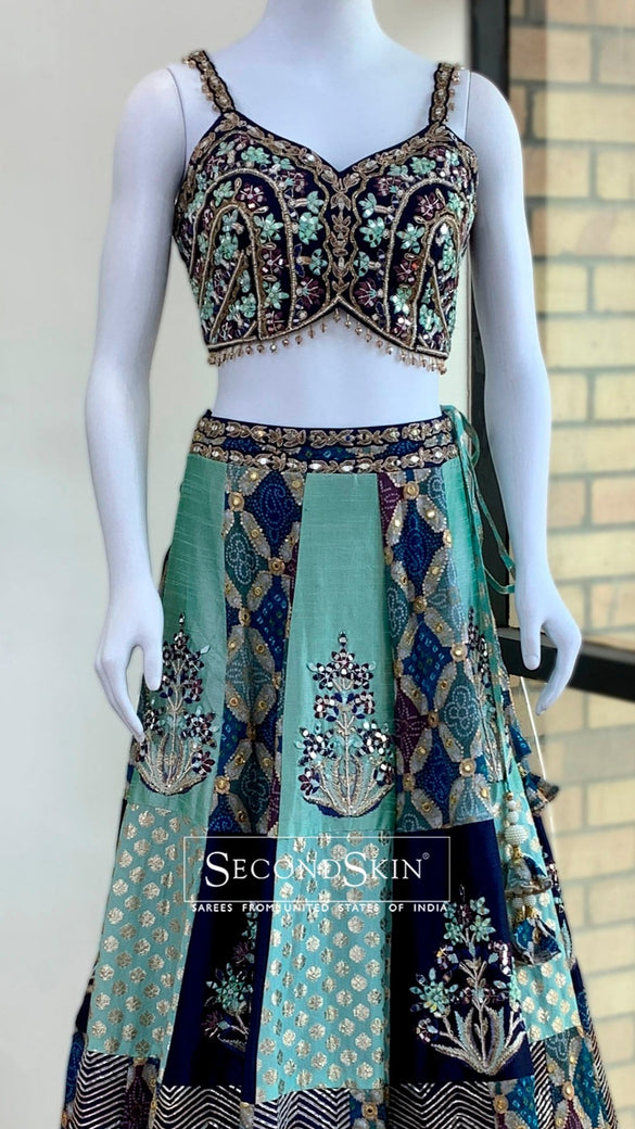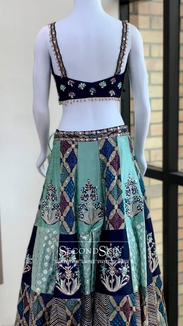 This multi-colored lehenga set showcases a geometric woven silk fabric with intricate details of gold zari, sequins, pearls, and mirrors in floral patterns on the skirt. Adding to its beauty is the contrasting floral embroidery on the top, while the net dupatta features a striped design with a floral border.