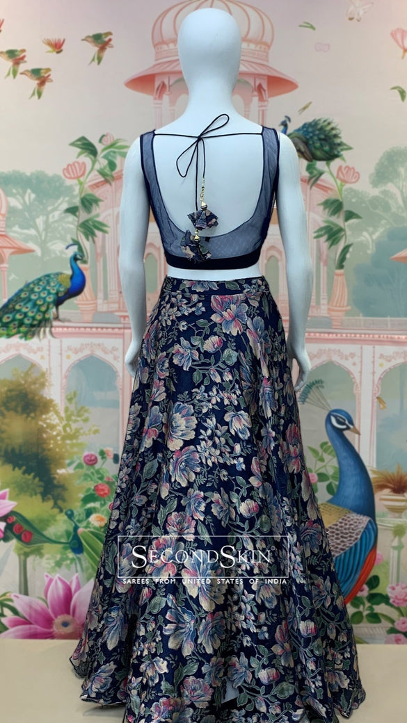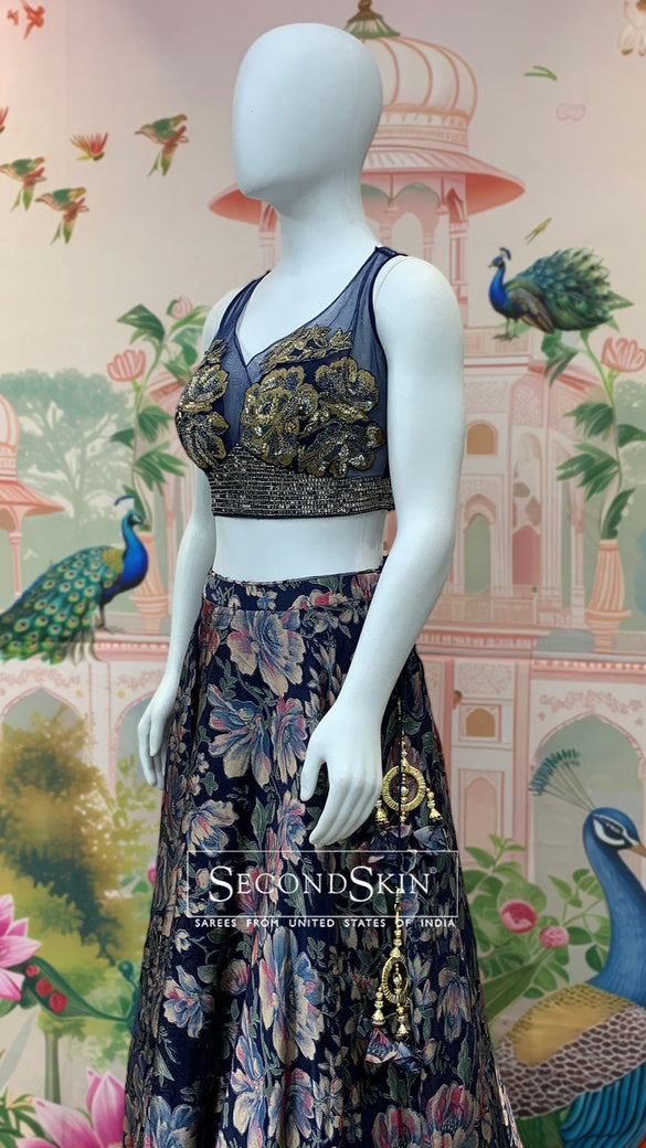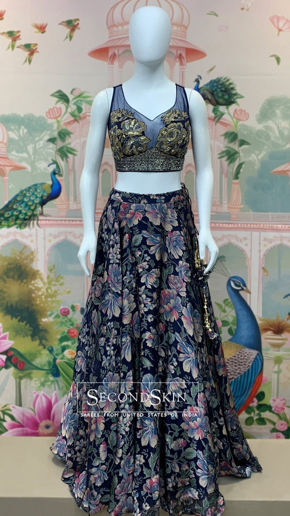 This navy-blue georgette lehenga features a floral print design, self sequins, and a stunning floral blouse with glass bead embellishments. The included dupatta is made of net fabric and features self sequin buttis and a border.