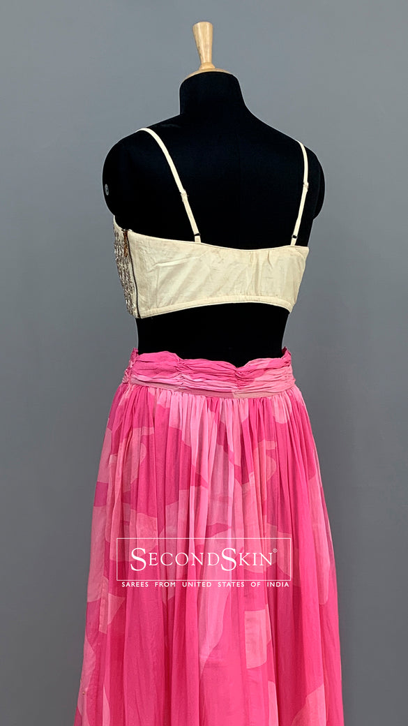 Pink Georgette Floral Lehenga Set with a delightful floral print and intricate sequence detailing. The creamy raw silk blouse is enriched with stunning mirror-work, while the georgette dupatta features an elegant self pattern and dangling mirror work tassel.