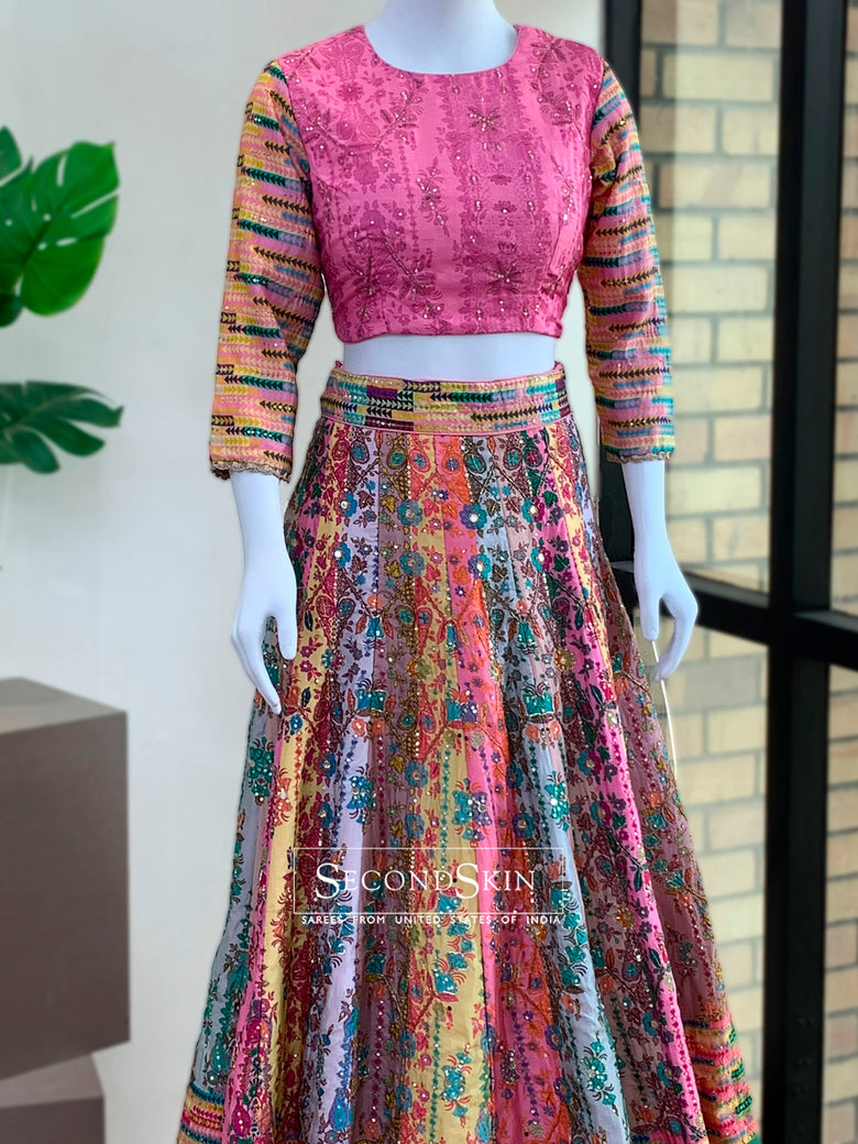 This Silk Floral Lehenga in Multi-Colour features an intricate weave with all-over floral print and embellishments of sequins and glass beads. The contrasting blouse is also printed with designs and decorated with work, while the dupatta adds a touch of elegance with its printed buttis and scalloped floral border.