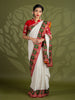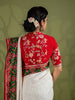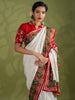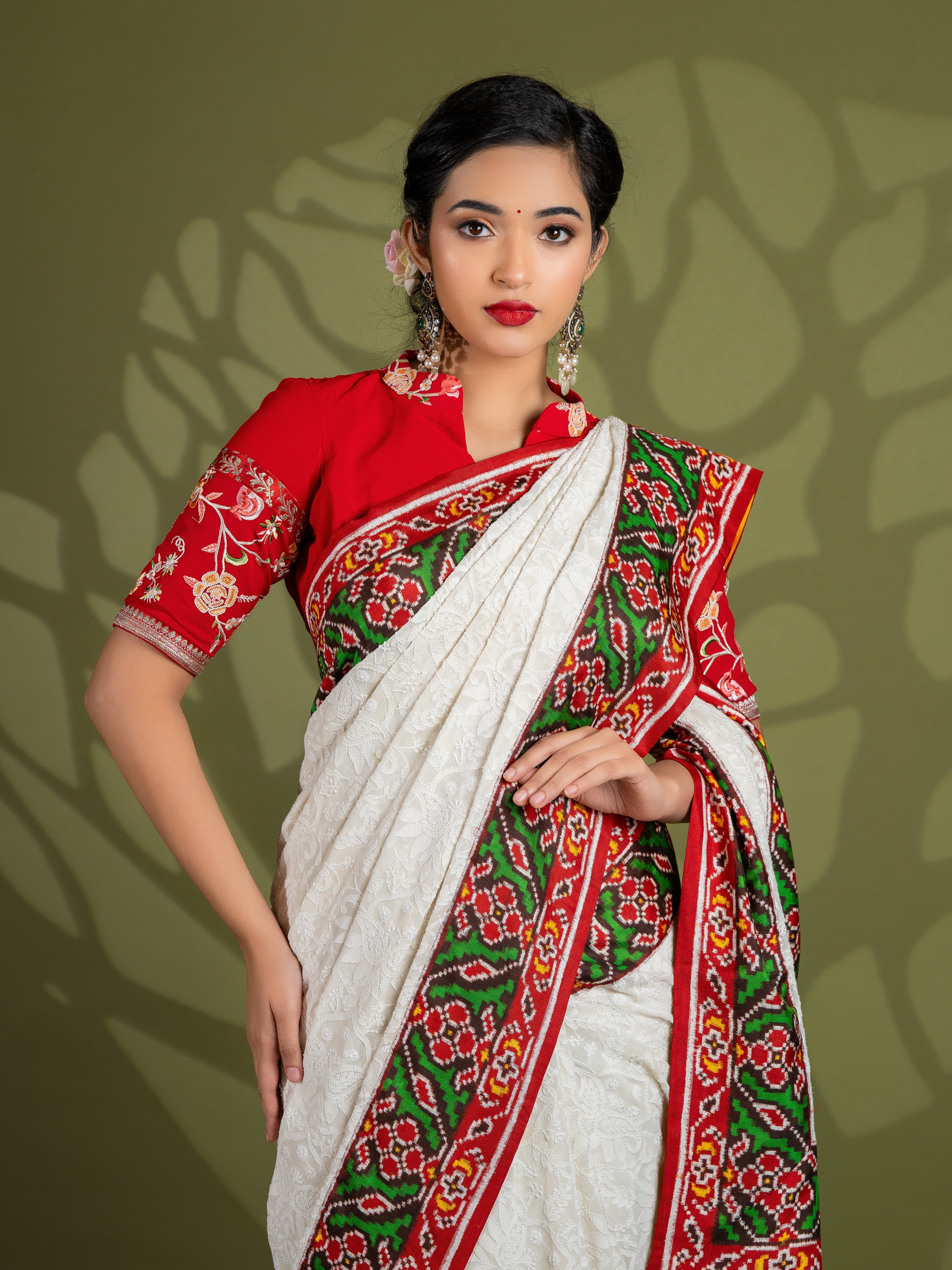 Fusion chikankari saree showcases an intricate floral jaal weave all over. The contrast floral patan patola border and pallu add a touch of elegance to the white color. Along with the saree, you will receive an unstitched blouse in a complementary, plain design with border.