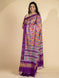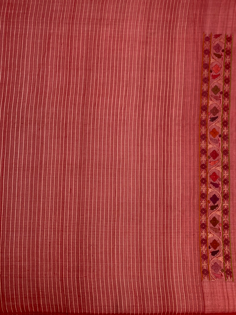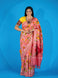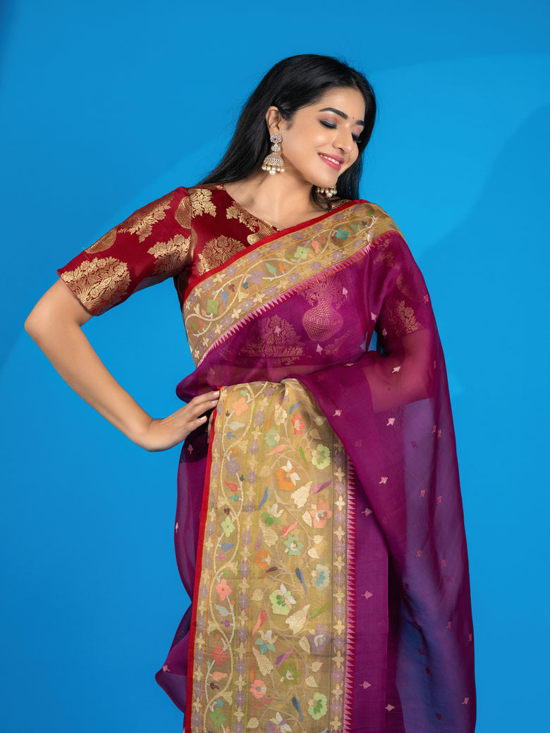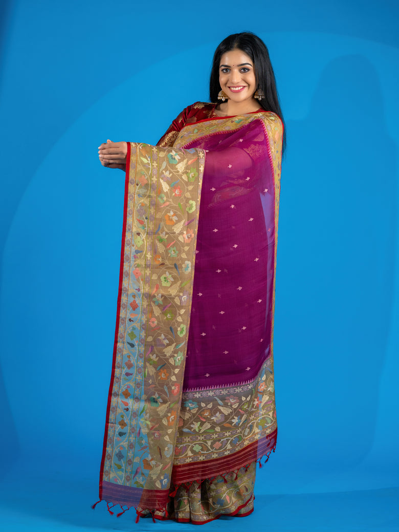Magenta-pink Jamdani banarasi kora saree features intricate gold zari floral buttis all over the weave, along with a contrasting gold-silver zari meenakari jamdani weave floral border and pallu. The unstitched blouse piece included is adorned with a border of gold zari stripes to complement the saree's design.
