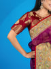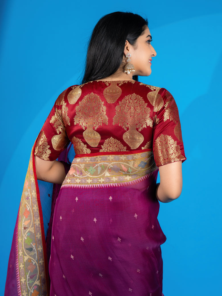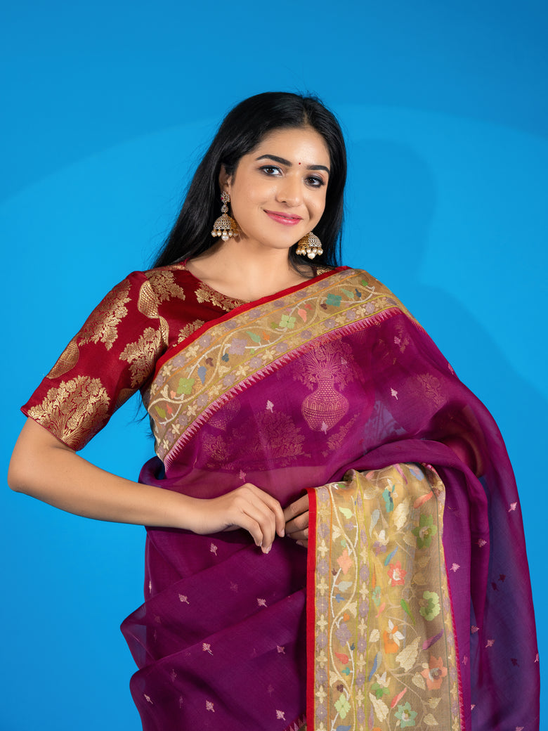 Maroon banarasi silk blouse boasts a stunning design with gold zari floral buttis and self sleeves.