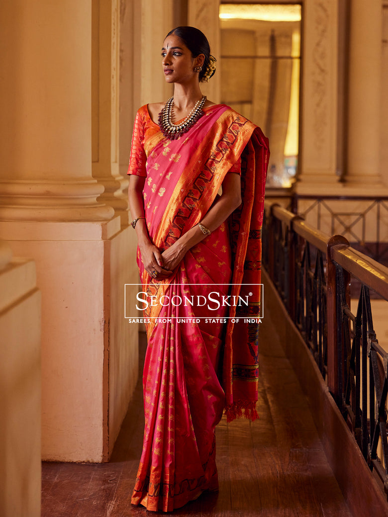 This stunning Kanjeevaram with Paithani Saree in pink exudes luxury. Adorned with intricate gold zari motifs featuring animal motif, it also boasts an elegant gold zari paithani tissue floral border. The Paithani Style border adds a touch of opulence, while the Multi-color Floral on Tissue pallu captures the essence of traditional Indian fashion.