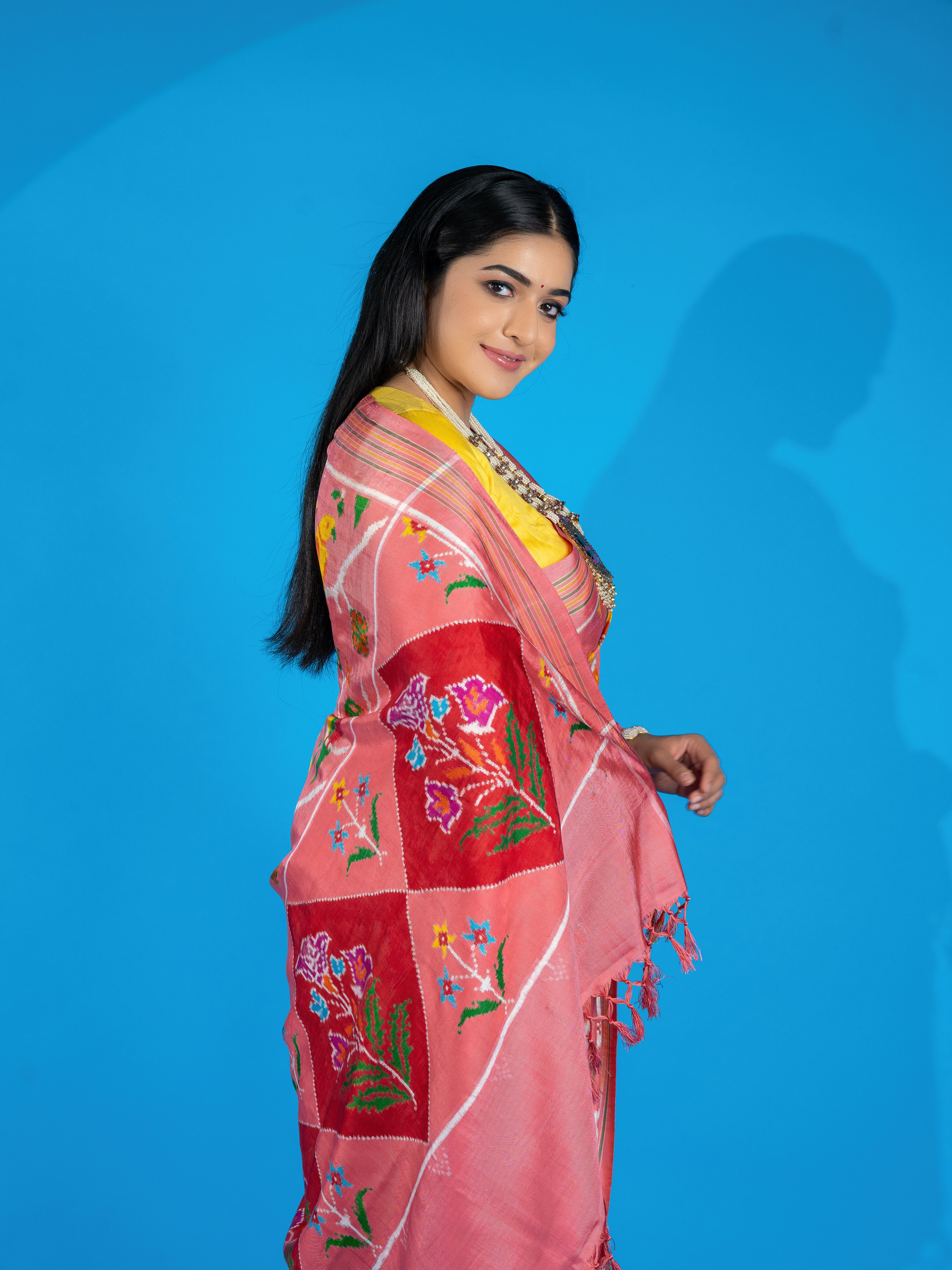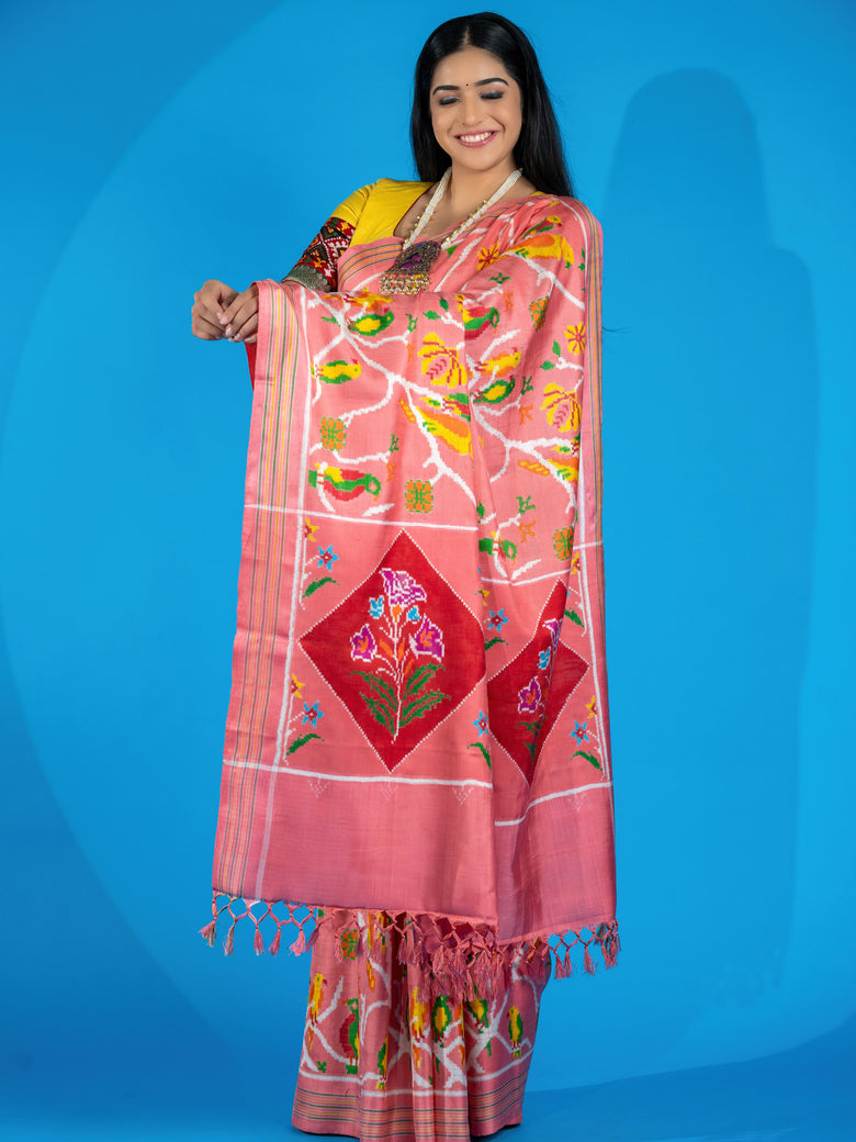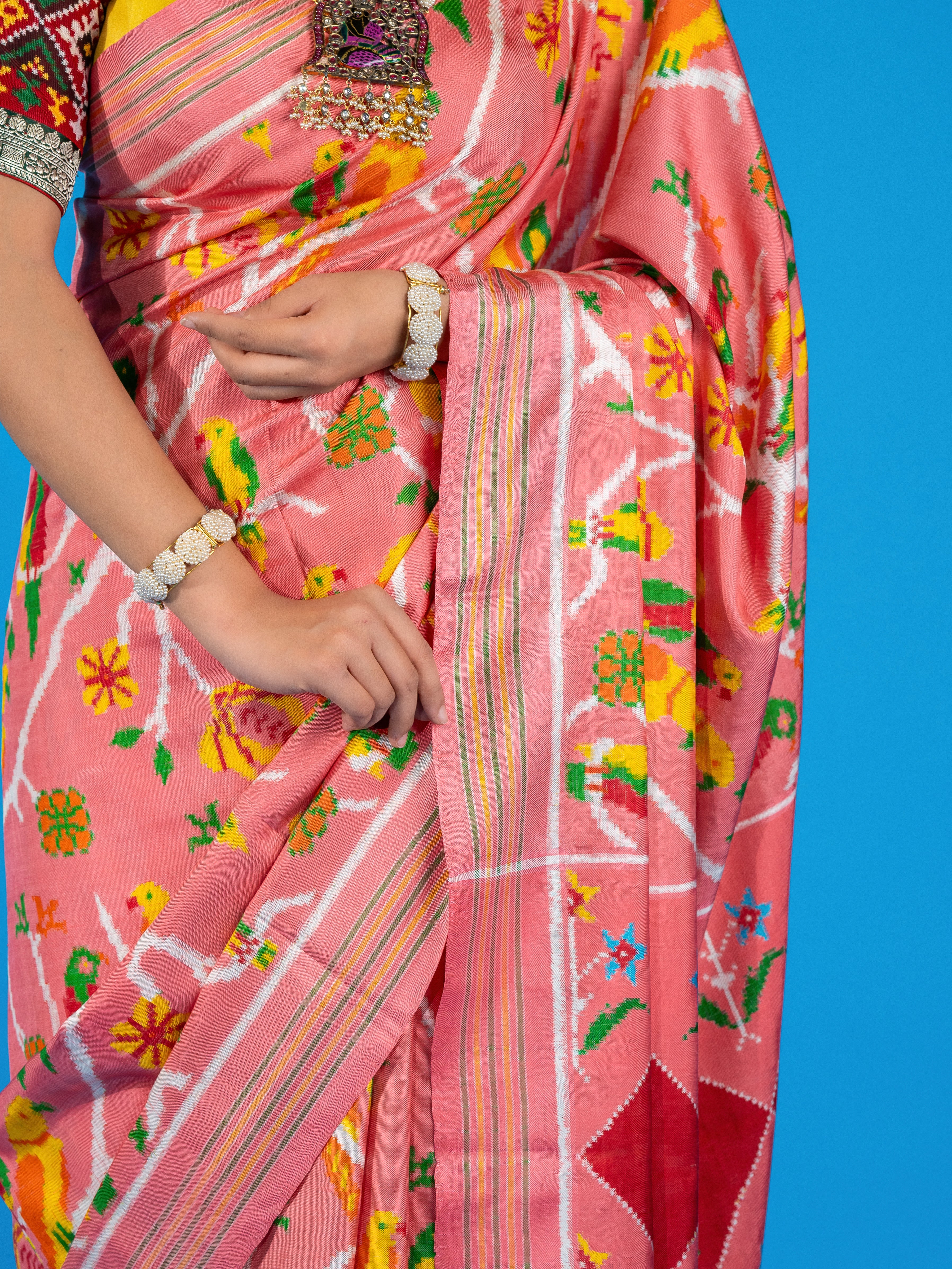 This double ikat patan patola saree boasts a handwoven design with intricate floral and bird motifs, features a self-stripes border and a floral pallu, all in a stunning peach color.