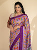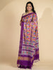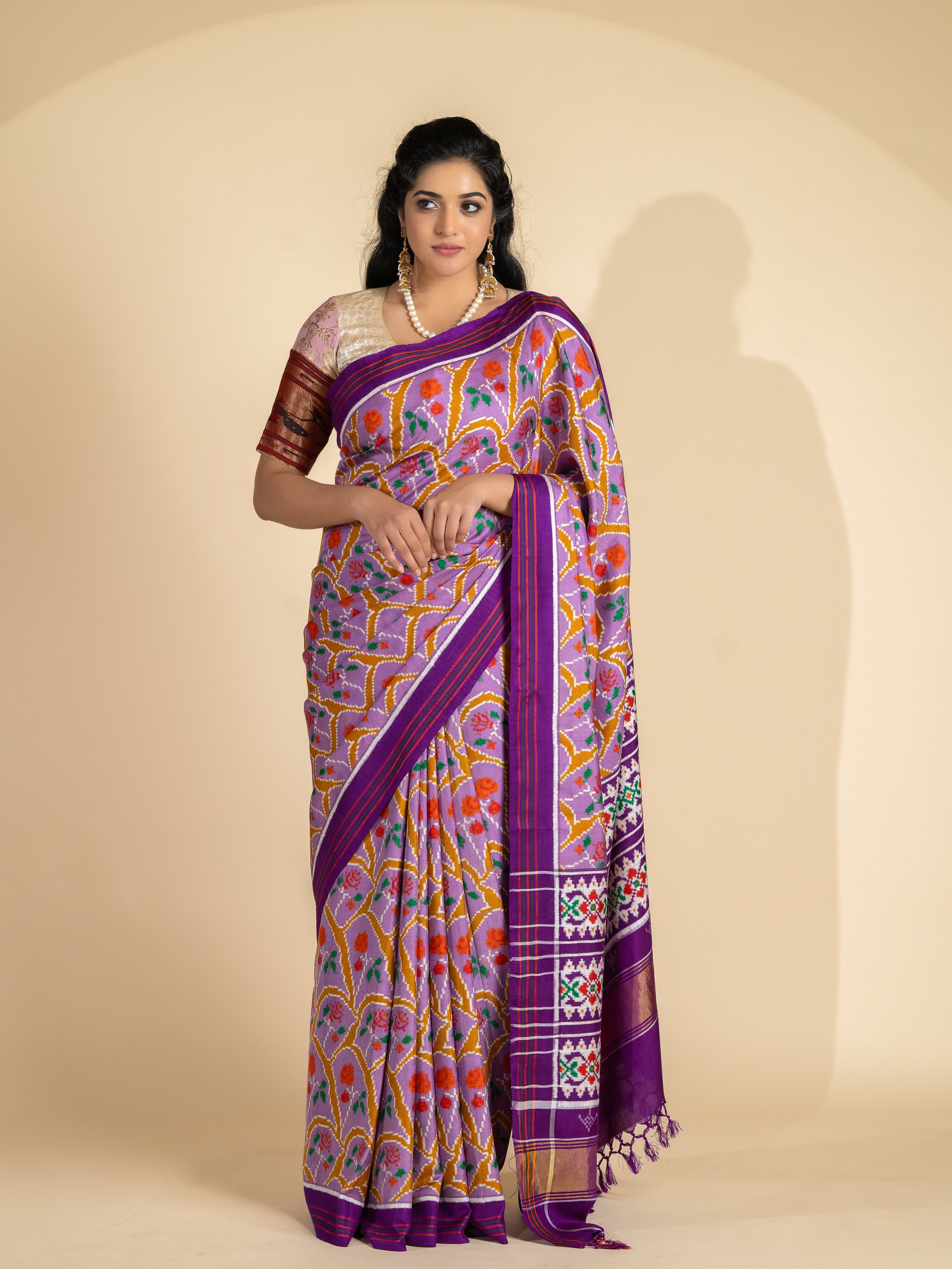 Handwoven patan patola saree in a captivating lilac hue showcases a double ikat design with intricate geometric patterns and floral buttis. The contrasting horizontal border and floral pallu add a delightful touch to its overall appearance.