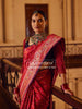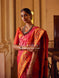 The saree comes in a beautiful reddish-pink color with an intricate gold zari and meenakari floral jamdani design on the body for a luxurious and elegant look. It also features a self meenakari veins floral border, adding a delicate and traditional touch. The self gold zari brocade pallu is adorned with floral vines to enhance the richness and beauty of the saree. .