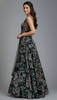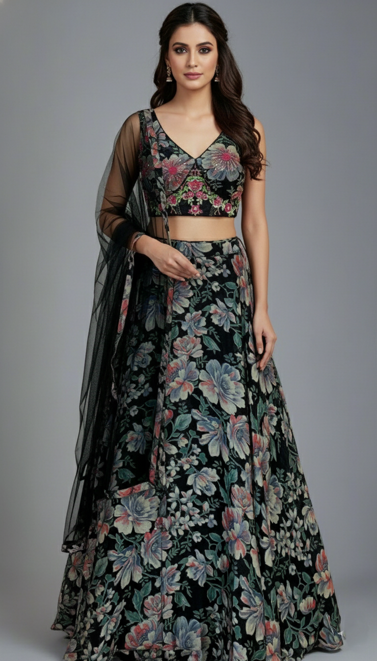 This black silk lehenga features an elegant design with floral print throughout. The lehenga also includes self-designed floral sequences and glass bead work on a printed blouse. It comes with a dupatta made of self plain net fabric with a border.