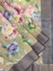 This black cotton kota saree features a stunning all-over floral design, accompanied by a contrasting gold zari floral border and brocade pallu. The saree also comes with a matching self-printed blouse, adorned with a zari border.