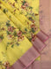 This mango-yellow cotton kota saree features a sophisticated floral print, highlighted by a bold gold zari border and brocade pallu. The accompanying blouse enhances the overall aesthetic with a complementary self floral print and zari border.