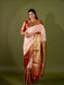 Gadwal Pattu Saree comes in a beautiful mango-yellow color with a self brocade border and self paithani design pallu. The saree features all over gold and silver zari birds motif buttis, and also includes an unstitche blouse with a self floral buttis and border.
