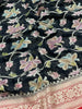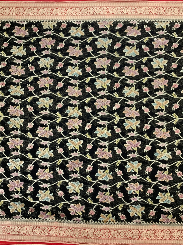 Georgette Banarasi Saree in black shade featuring all-over gold zari and meenakari floral jaal detailing, contrasted with a floral border and floral butta pallu. The included blouse is plain with a zari border.