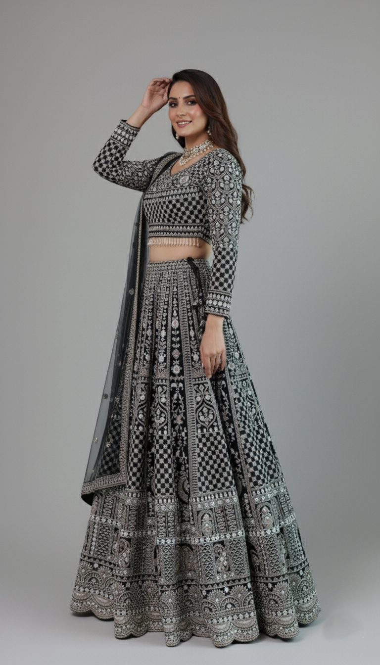 This grey lehenga set showcases a beautiful net fabric with intricate hand-embroidered floral and bird motifs. The lehenga itself is adorned with delicate sequence and thread weave embroidery, while the blouse features floral embroidery. The accompanying dupatta is made of net fabric and also features thread weave and sequence floral buttis, complete with a border.