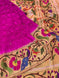 This saree displays a classic geometric ikat design, set off with a vivid Kaddi border and ikat pallu in contrasting pink and blue tones. The accompanying plain blouse is also designed with a Kaddi border.