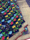 This navy-blue Jamdani saree is carefully handwoven with a beautiful floral design using gold, silver, and meenakari thread. The border and pallu feature gold and silver zari work to complement the intricate body. The blouse is also plain with a zari border. Perfect for adding elegance and charm to any occasion.