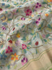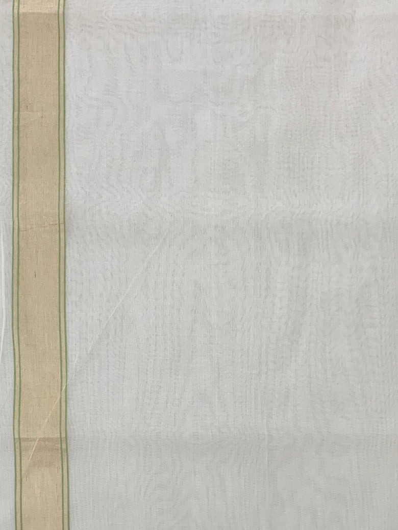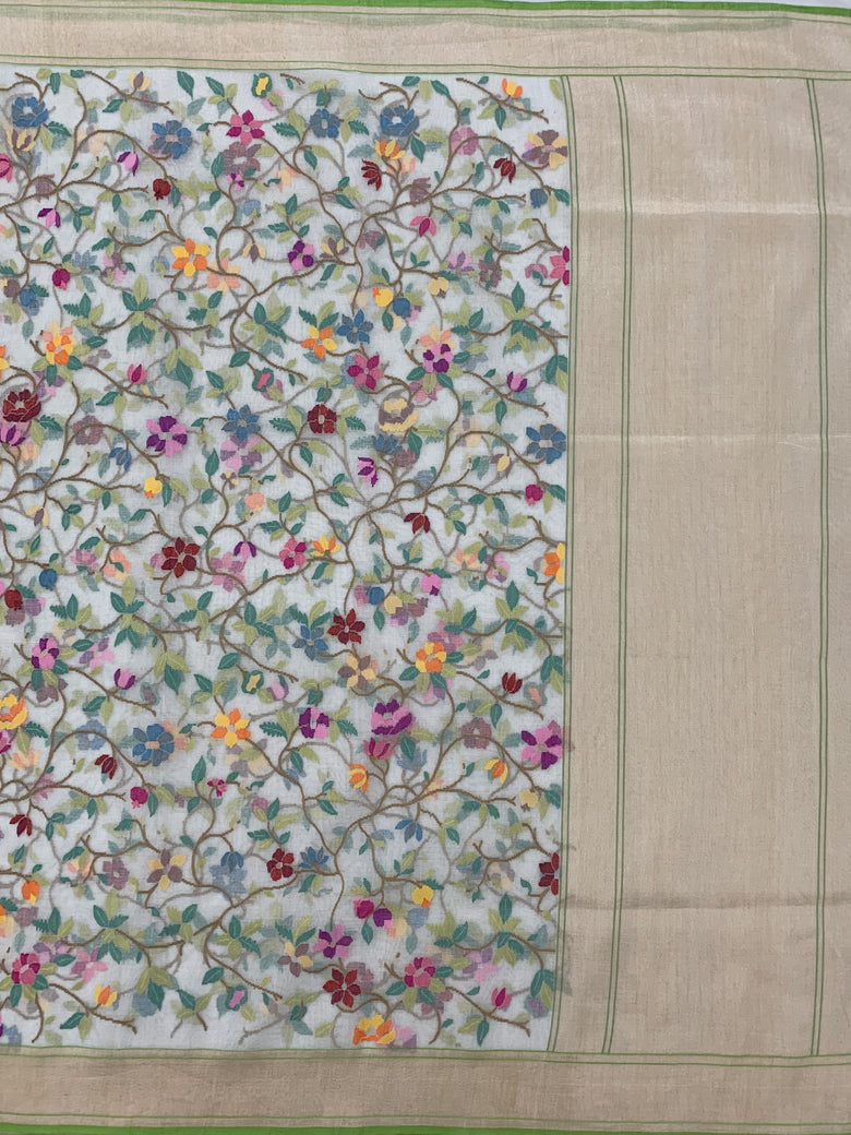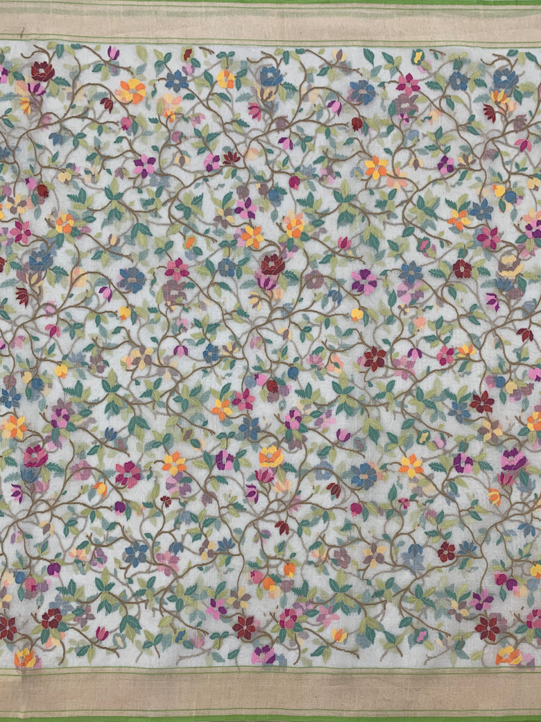 This cotton material Jamdani Saree showcases a vivid floral motif with gold zari kaddi bordering and a basic blouse featuring a kaddi border. Boasting a pristine white hue, this garment is a superb selection for formal events.