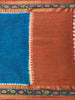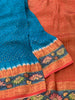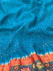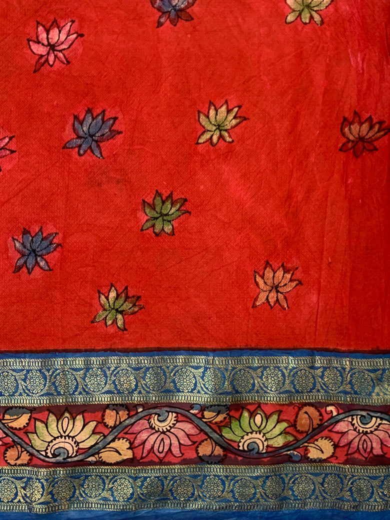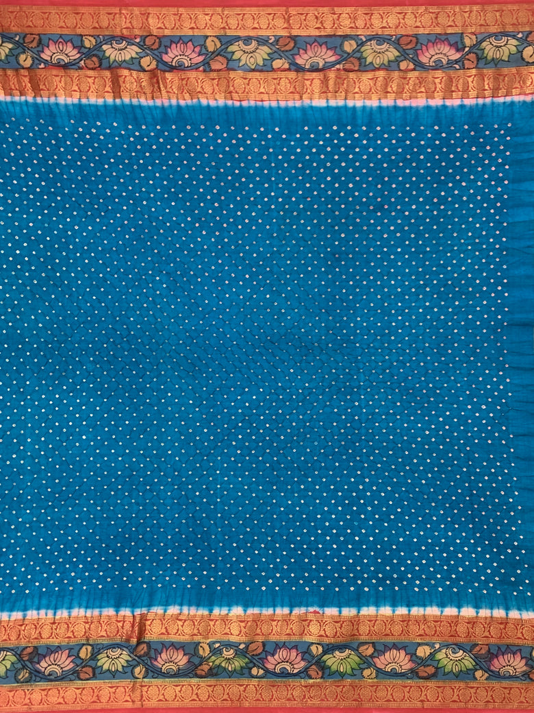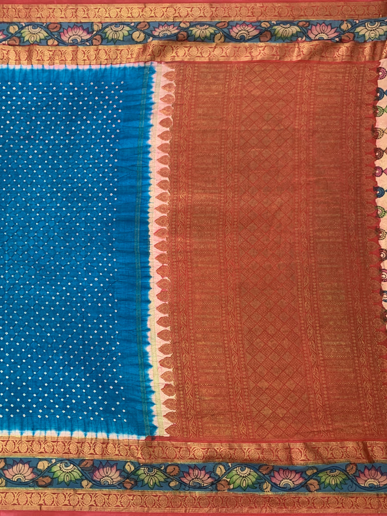 This Kanjeevaram bandhani saree features an intricate bandhani tie-dye pattern across its surface, contrasted with a pen-kalamkari border and an elaborately designed brocade pallu. The accompanying blouse is blue in colour, displaying a classic pen-kalamkari design with a contrasting border.
