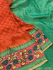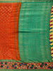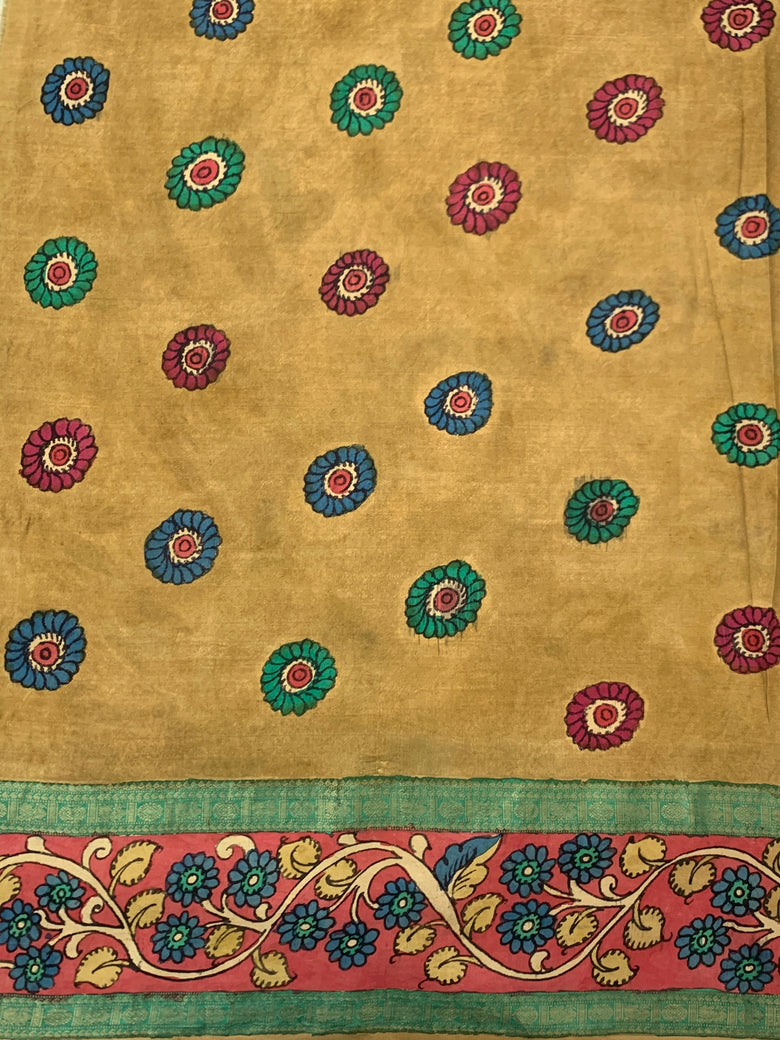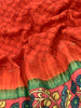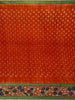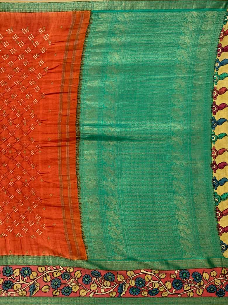 This Kanjeevaram bandhani saree has an all-over gold zari butta and tie-dye bandhani, contrast pen kalamkari border and traditional pallu. The saree is offered in a rust hue, and has a stylish contrast pen kalamkari blouse. This classic and timeless saree is crafted from superior quality material and features detailed gold zari, tie-dye bandhani.