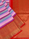 This Multi-colored Kanjeevaram brush painted saree showcases intricate gold zari stripes and a brush paint pattern throughout the body and border, handwoven with precision. The traditional Gold zari Gap border and brocade pallu beautifully amplify its elegant appearance. The primary color is Multi-color with a secondary color of pink, and it includes a matching blouse with a zari border.