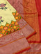 The Kanjeevaram Printed Saree showcases all-over kalamkari Printed on silk with a complementary gold zari traditional brocade yellow color border and brocade pallu. It features a contrasting plain blouse with a zari border.