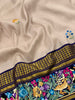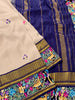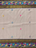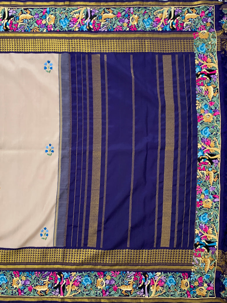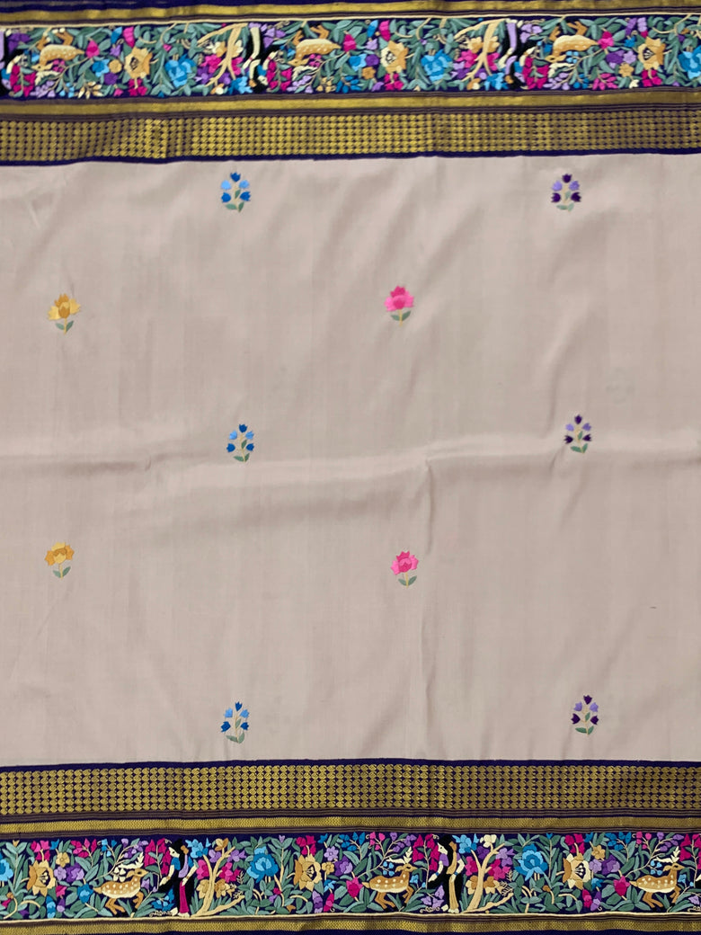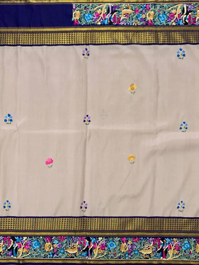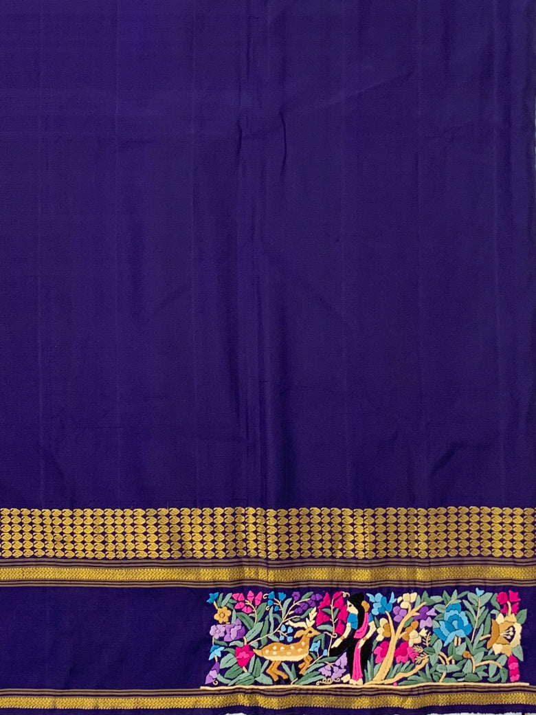 This Kanjeevaram Silk Saree showcases a multi-coloured parsi-gara butta adorned with a shimmering gold zari, and a Kanjeevaram pallu in a delicate pastel-mauve hue. The complimentary plain blouse is finished with a floral embroidery border, giving the ensemble a classical charm.