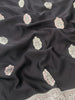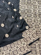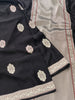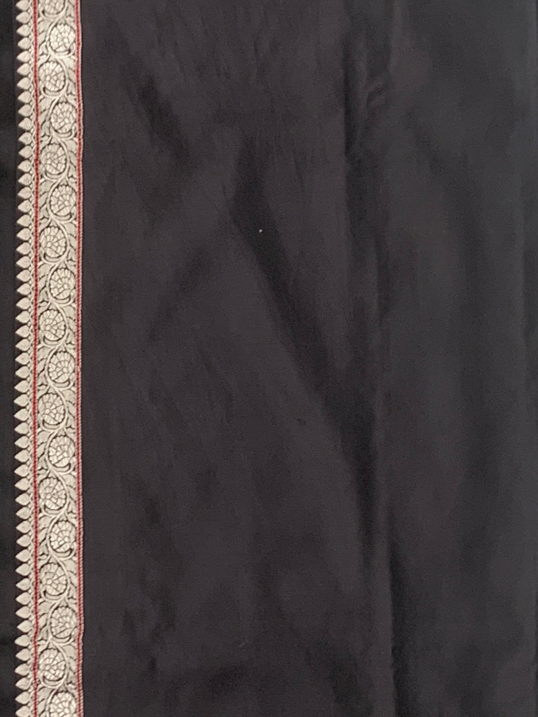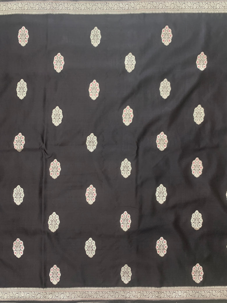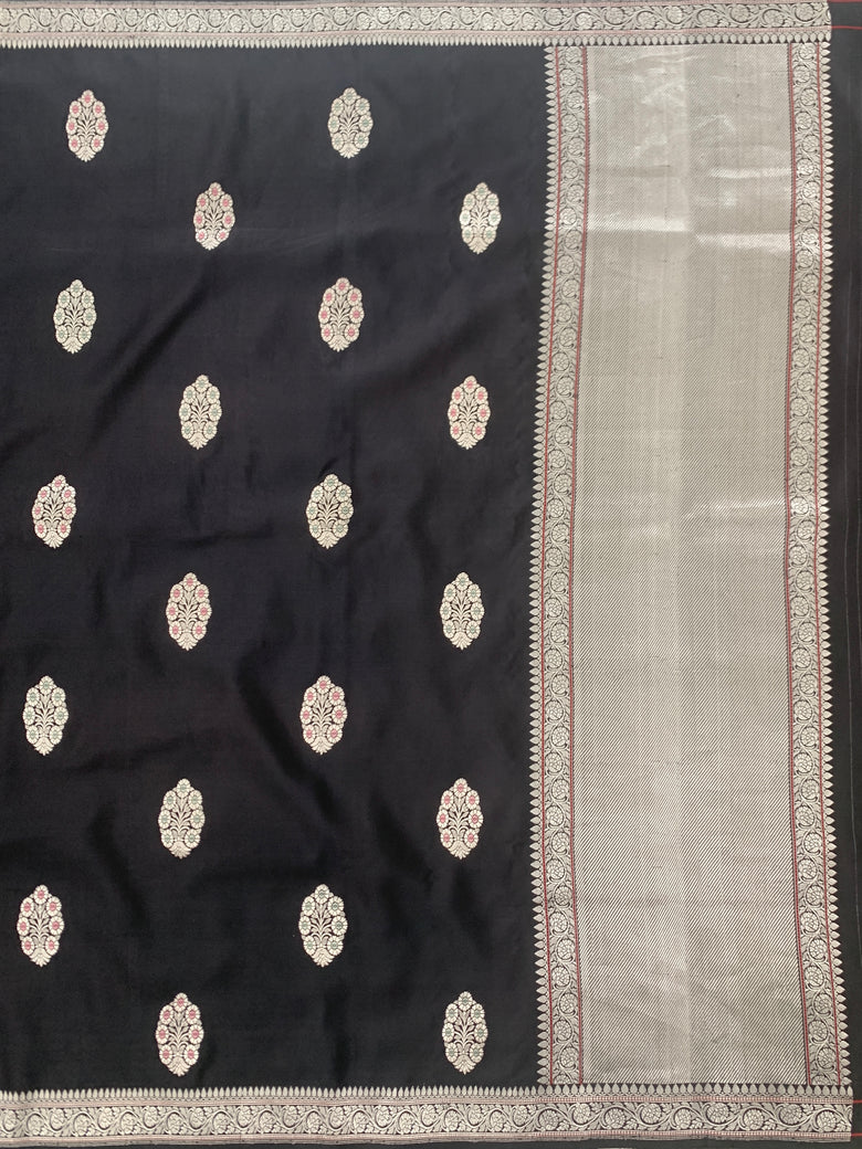Mashru silk saree with an all-over silver zari and thread weave floral butta, self floral border, and brocade pallu. This classic saree is black in colour and is completed with a self plain blouse and zari border.