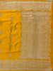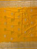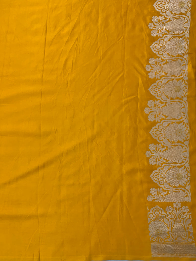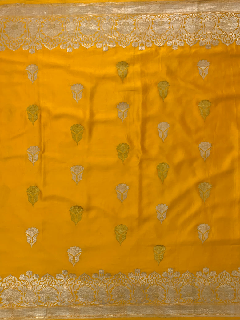 Mashru Silk Saree Dark-Mustard in colour flaunts an intricate gold and silver zari floral butta all-over the saree and a self-floral border. It is complemented with a plain self-blouse with a zari border, creating a stunning look.