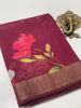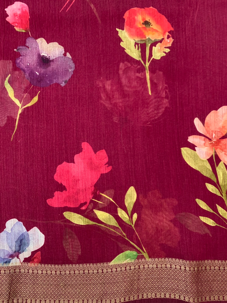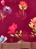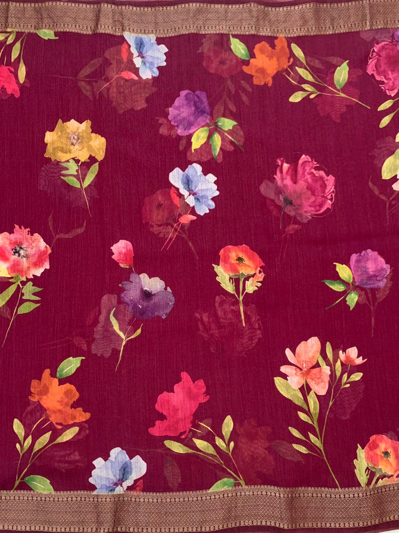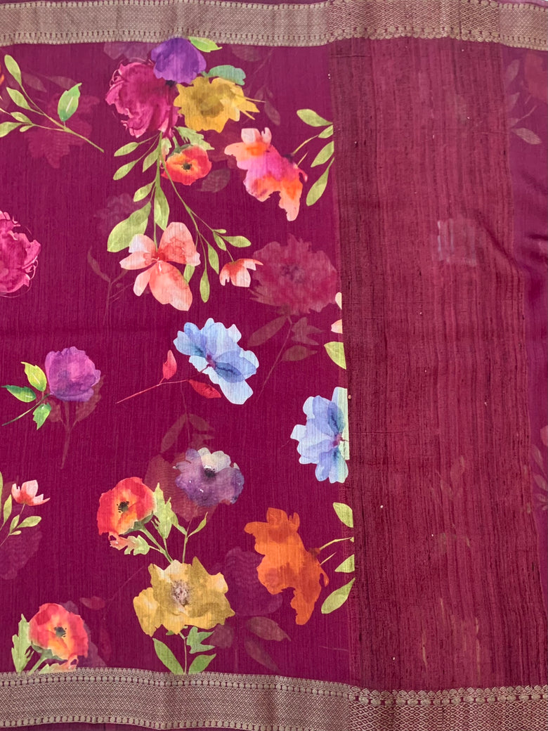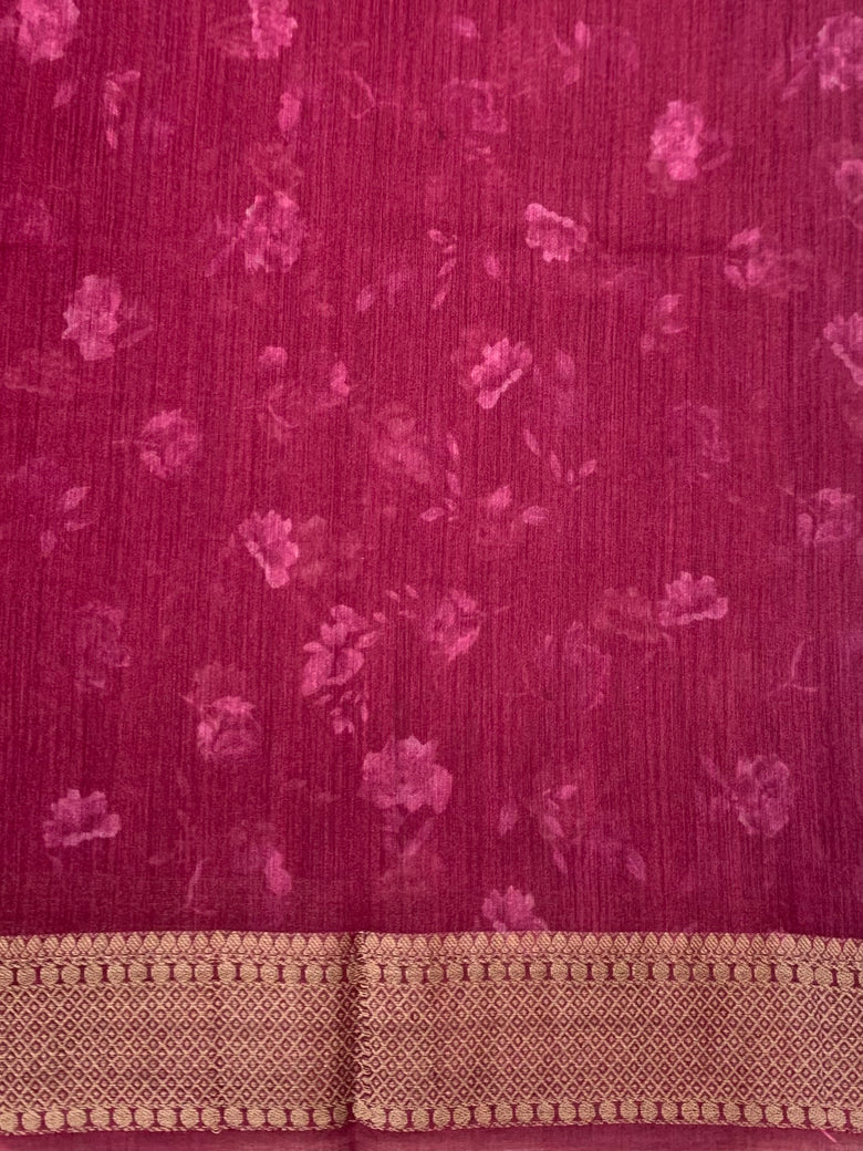 Crafted from pure moonga silk, this luxurious saree features an all-over floral print with an antique zari border and jute pallu, while its magenta-pink shade and self floral print with a border complete the look.