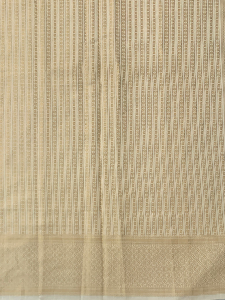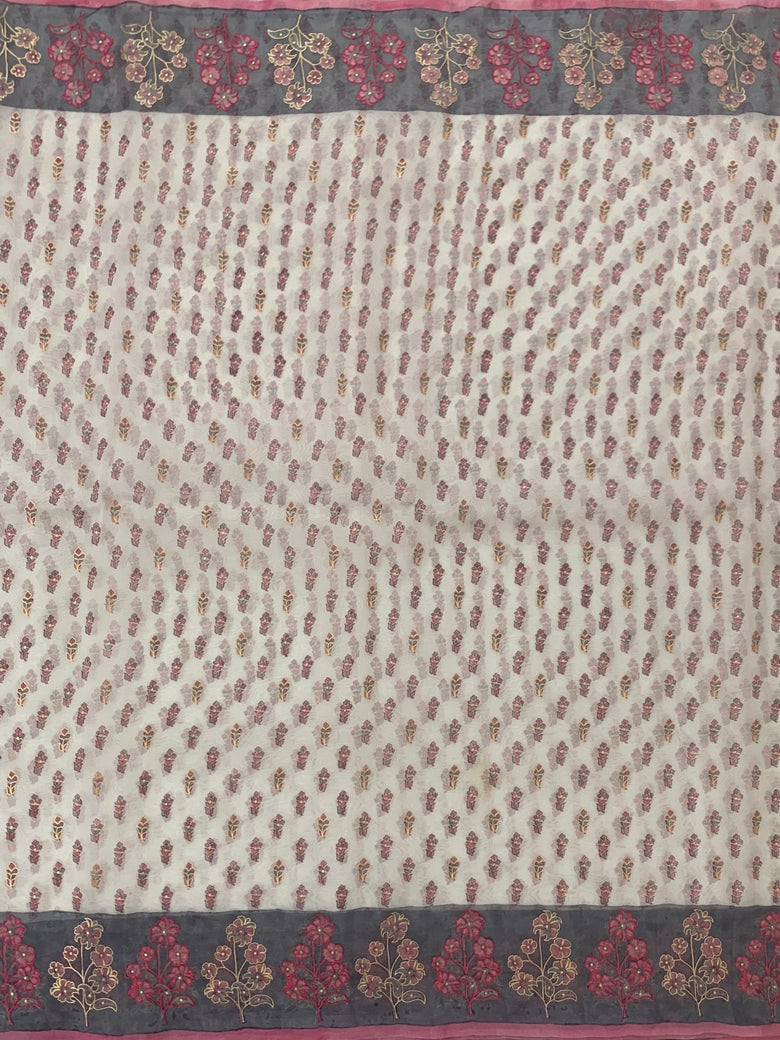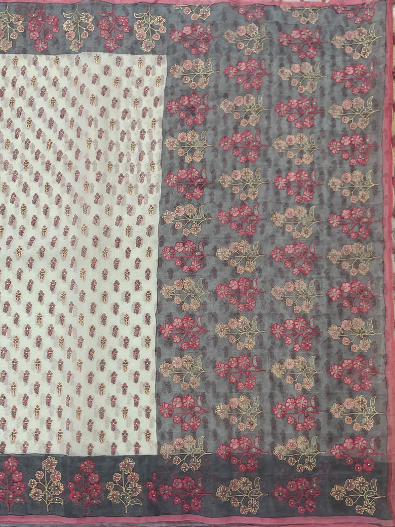 An Organza saree featuring a classic half-white hue boasts a striking floral butta Printed and aari work, accompanied by a contrasting floral butta border and pallu. The ensemble is polished off with a Banarasi brocade blouse, featuring a beautiful gold zari border.